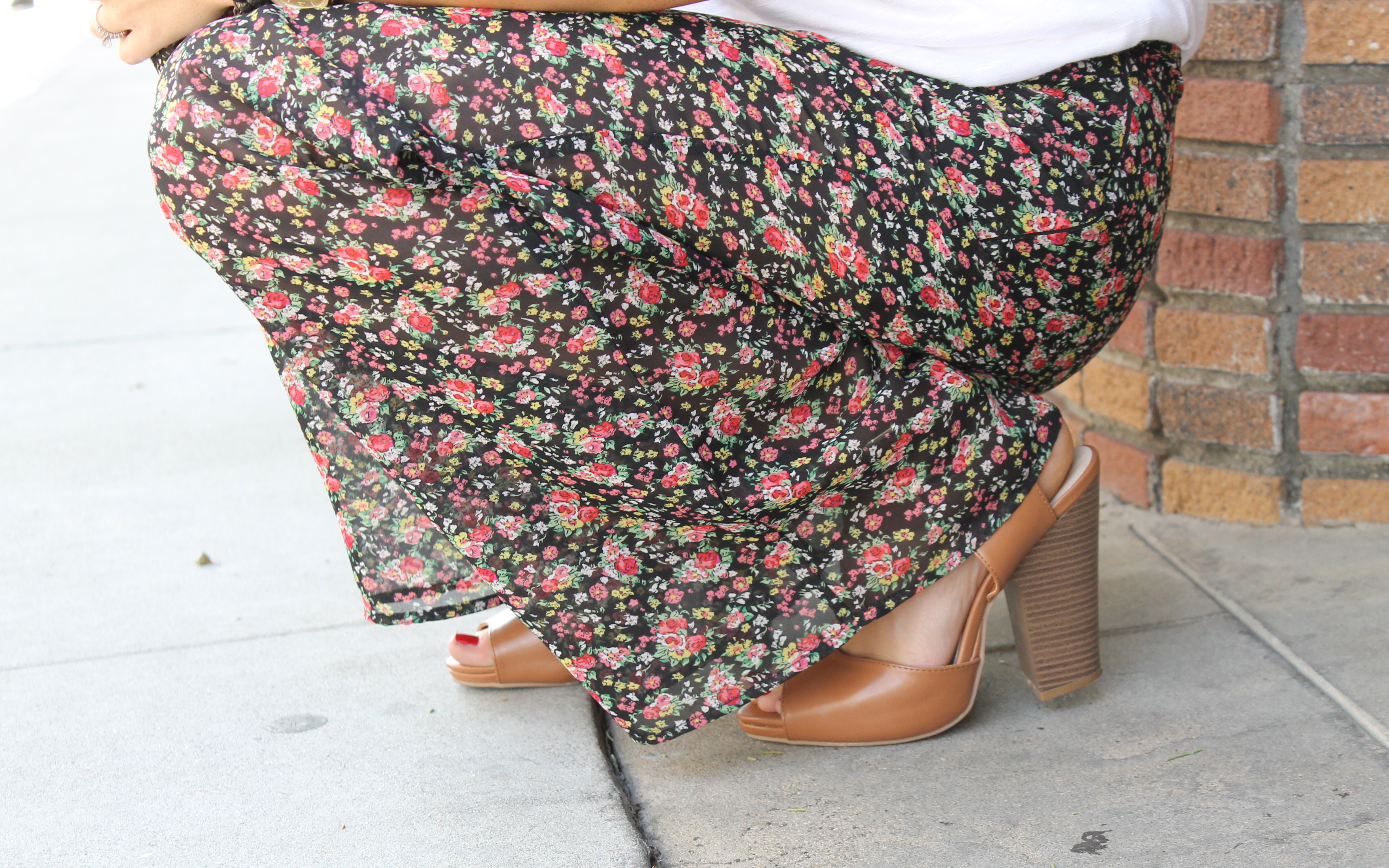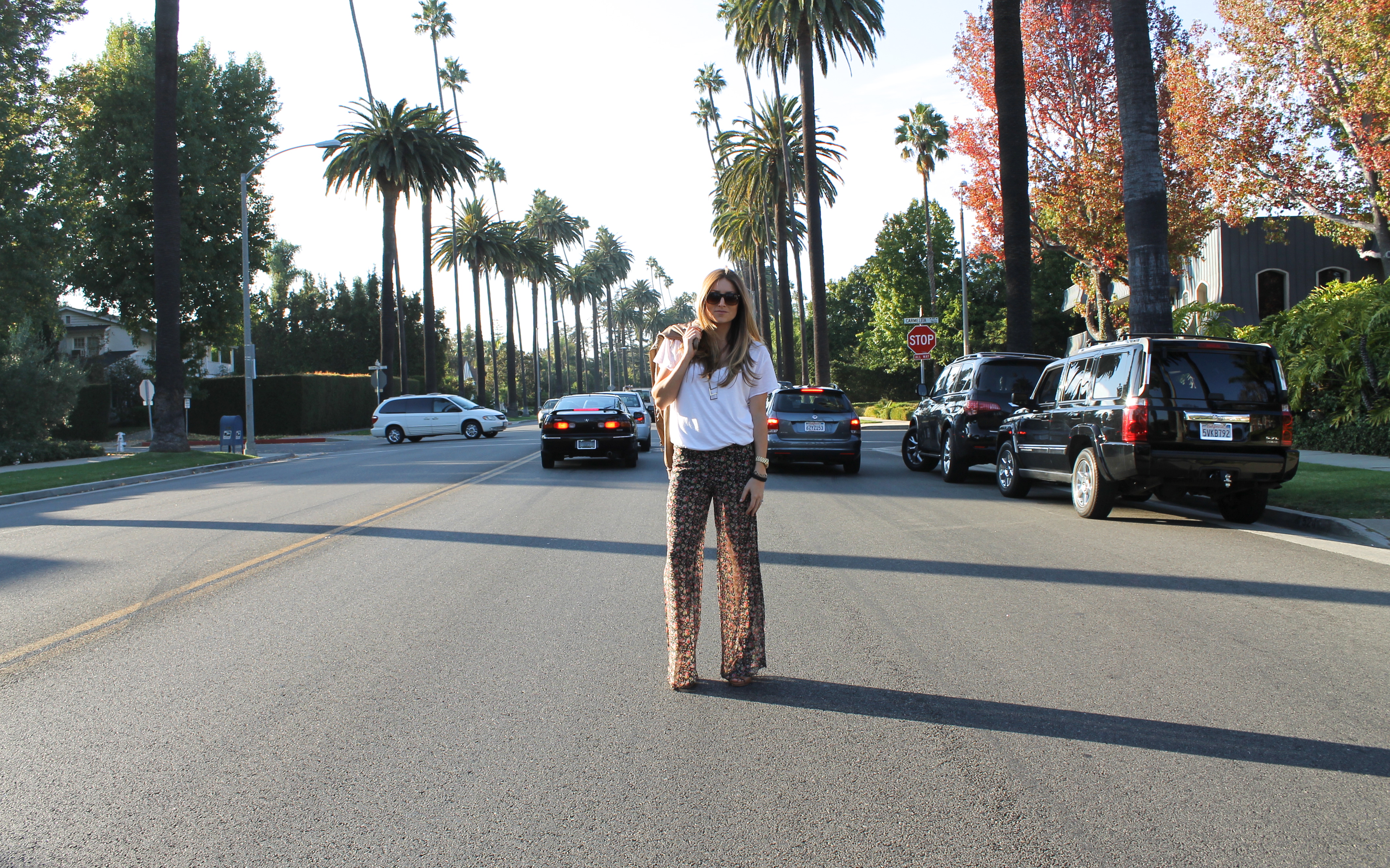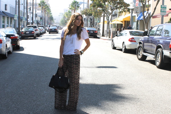 Living in Southern California makes it a little hard to jump right into fall fashion. When it is still 80 degrees in November you can’t bust out your puffer jackets quite yet! I like to bring fall into my wardrobe through color and fabric. For this look, I wanted the pants to be the statement piece. They have a beautiful floral print and a warm color palette. The sheer fabric lets me stay cool, but still look fall appropriate. I kept my top basic, and through in some awesome chunky brown wedges to finish off the look.