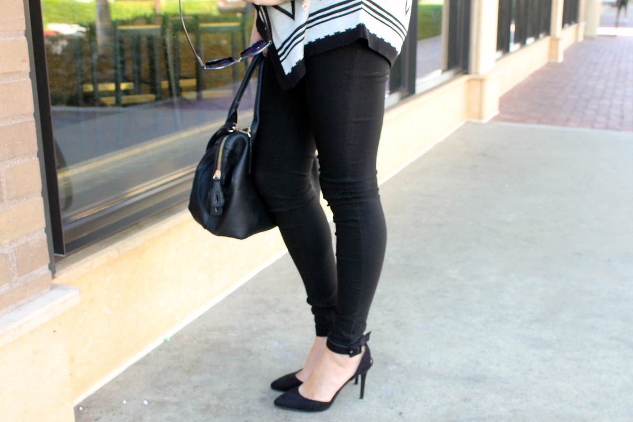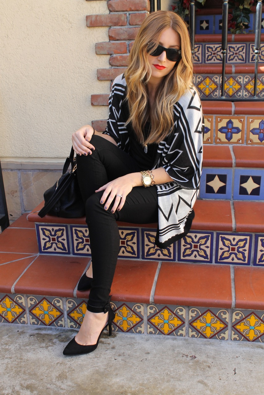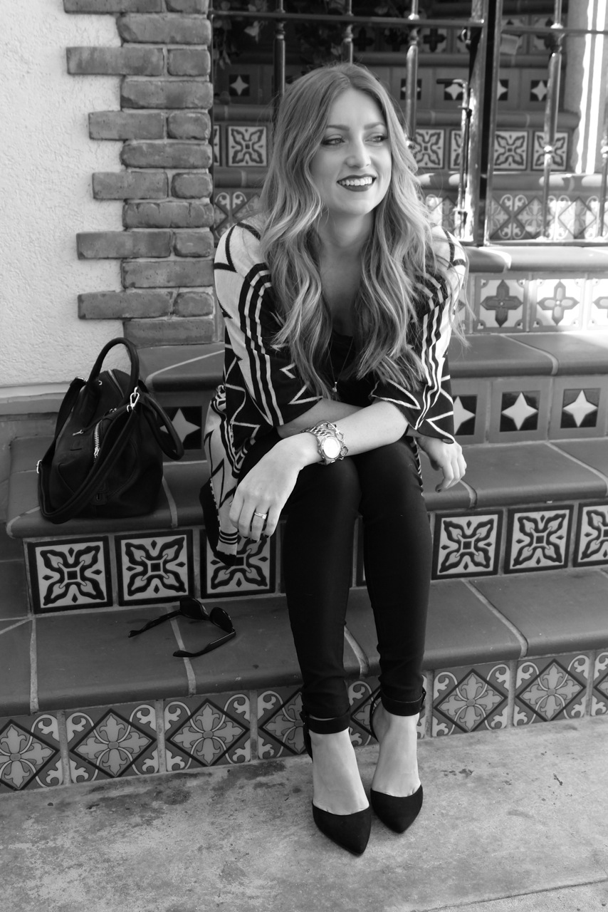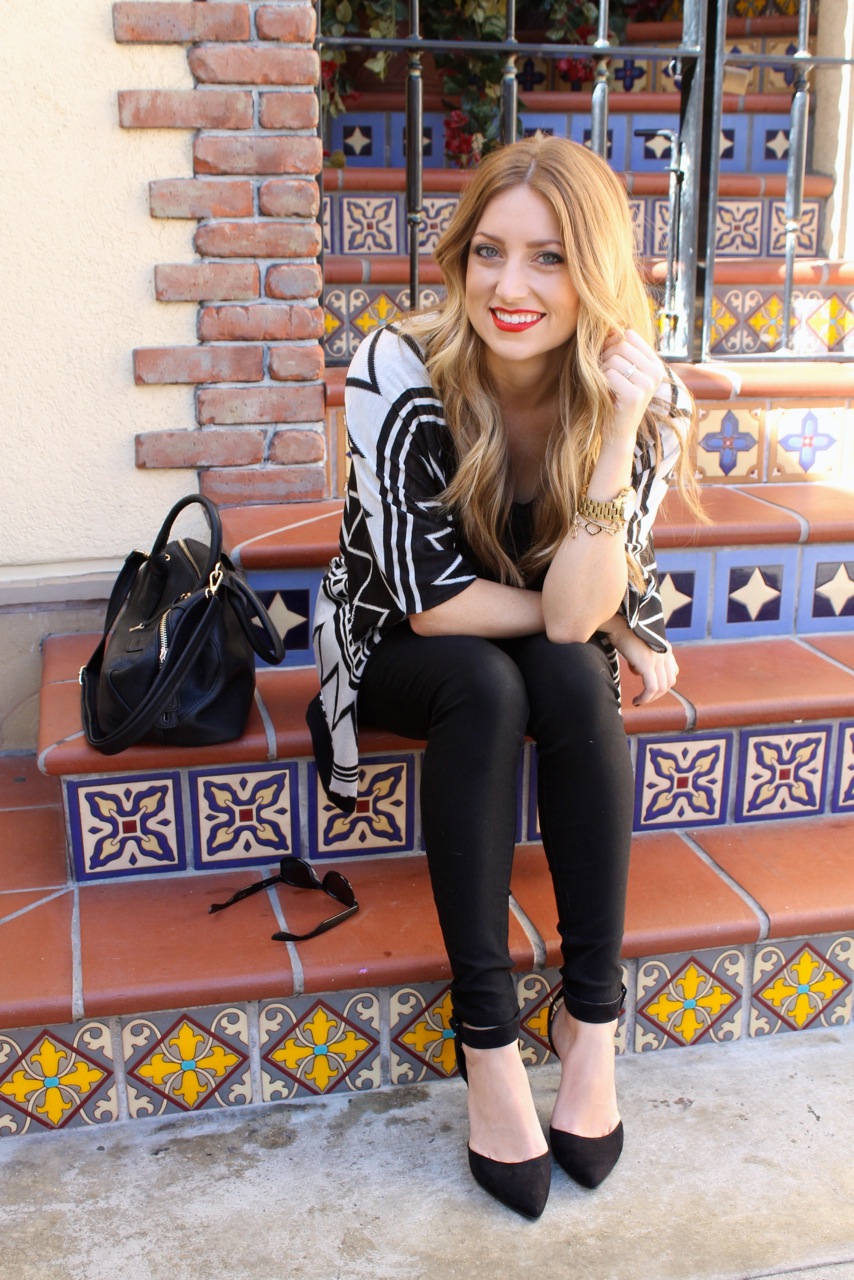 Black is clearly my go to color. I always start with a few basic pieces and then go from there. With this look, I started with a pair of black skinny jeans and a black t-shirt with awesome leather sleeves. I added a zig zap printed sweater and some classic black heels. I always view makeup as the finishing touch to any outfit, so I wore a classic red lip to pull the all black ensemble together.