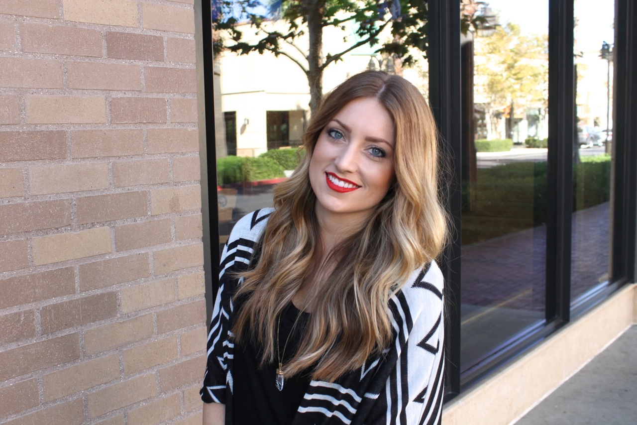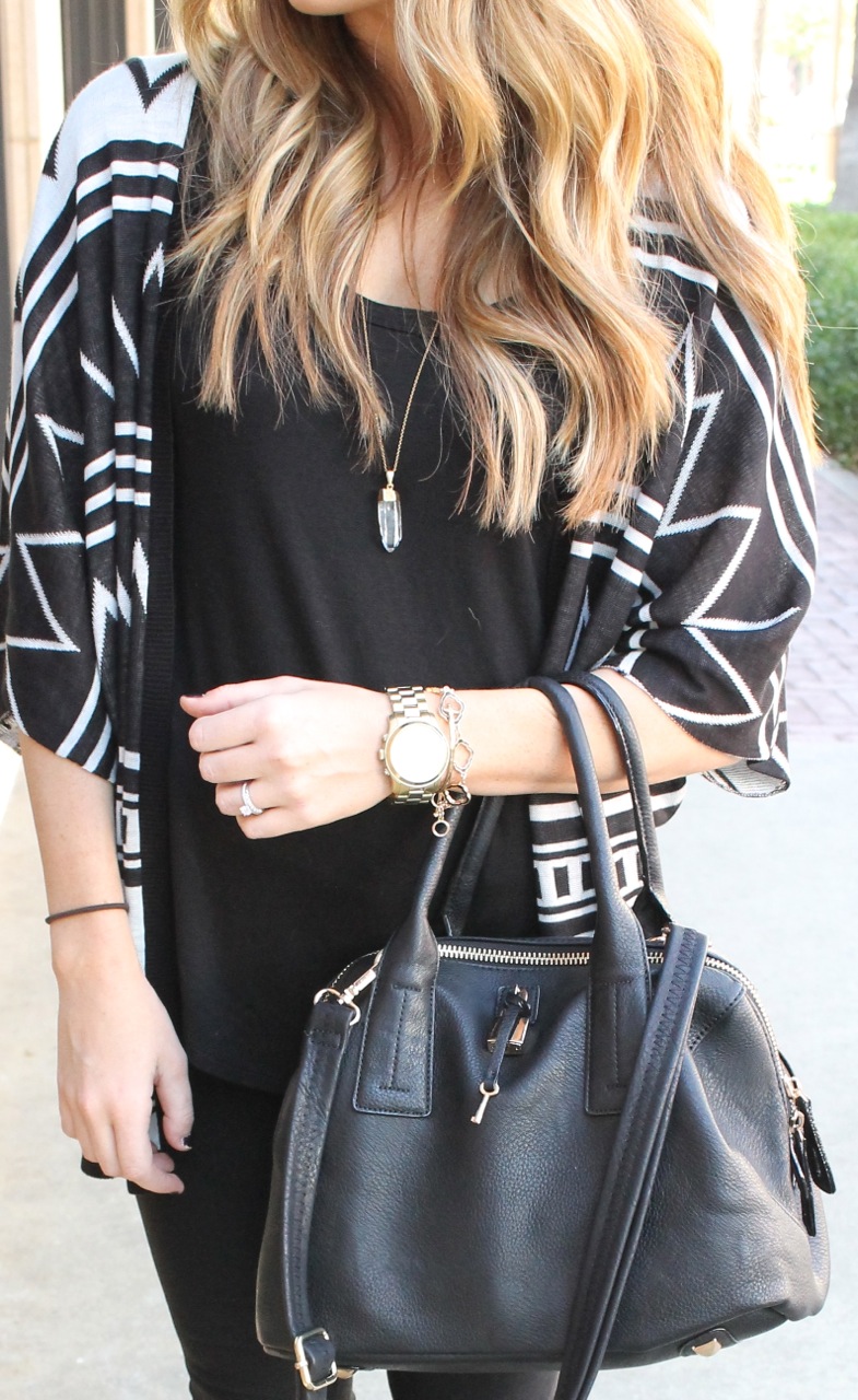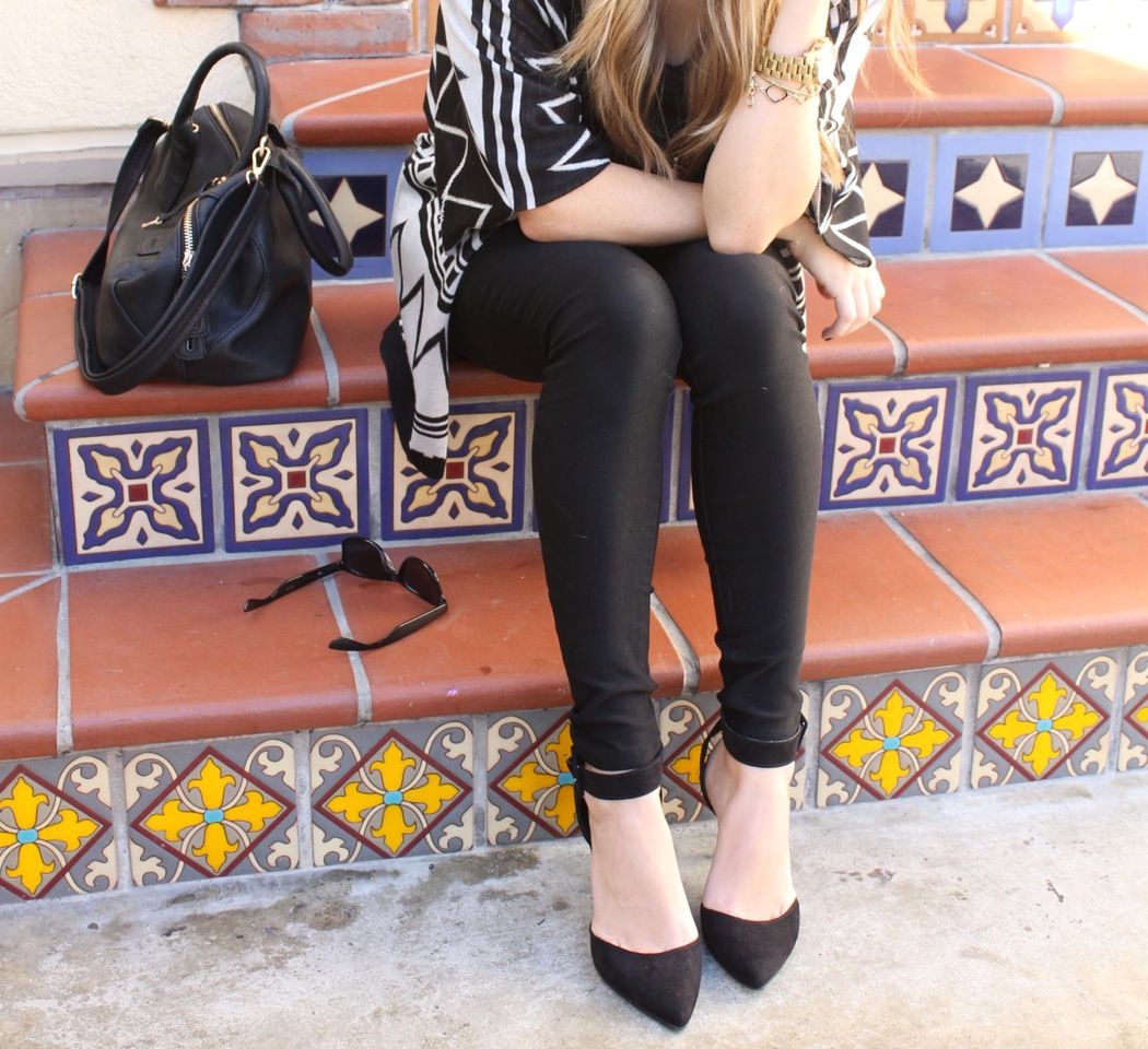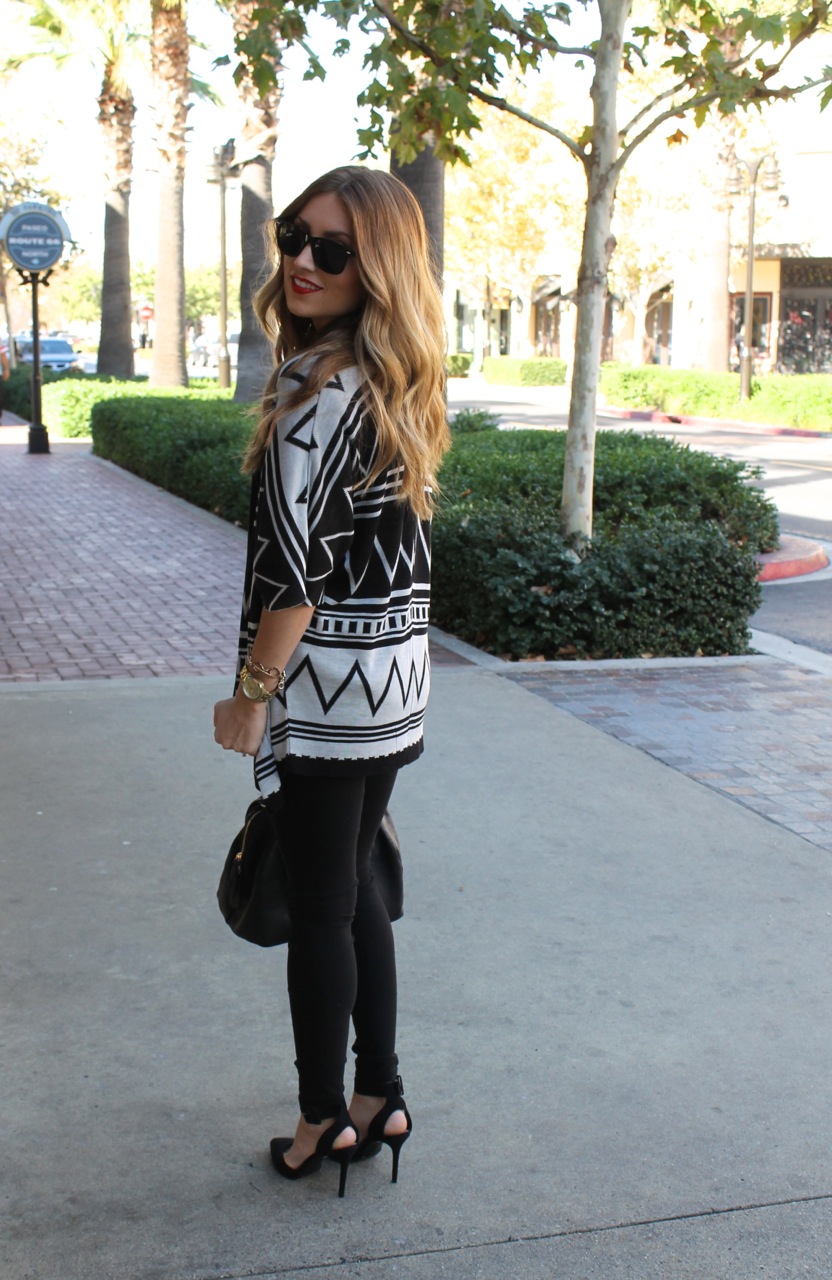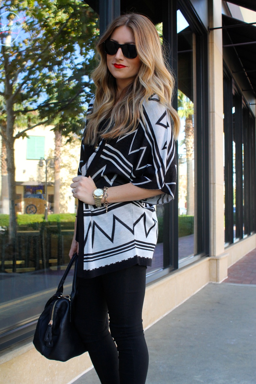 Black is clearly my go to color. I always start with a few basic pieces and then go from there. With this look, I started with a pair of black skinny jeans and a black t-shirt with awesome leather sleeves. I added a zig zap printed sweater and some classic black heels. I always view makeup as the finishing touch to any outfit, so I wore a classic red lip to pull the all black ensemble together.