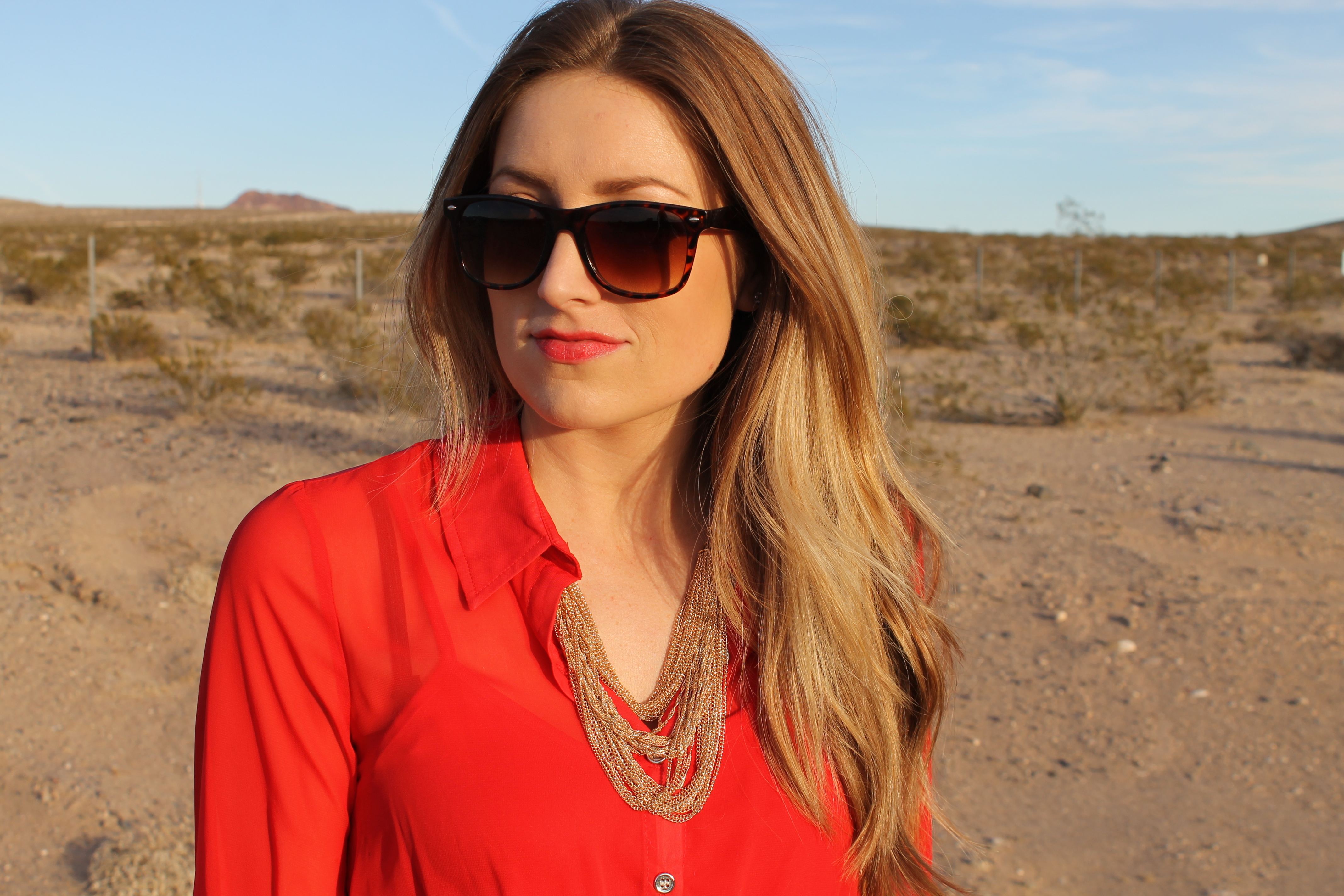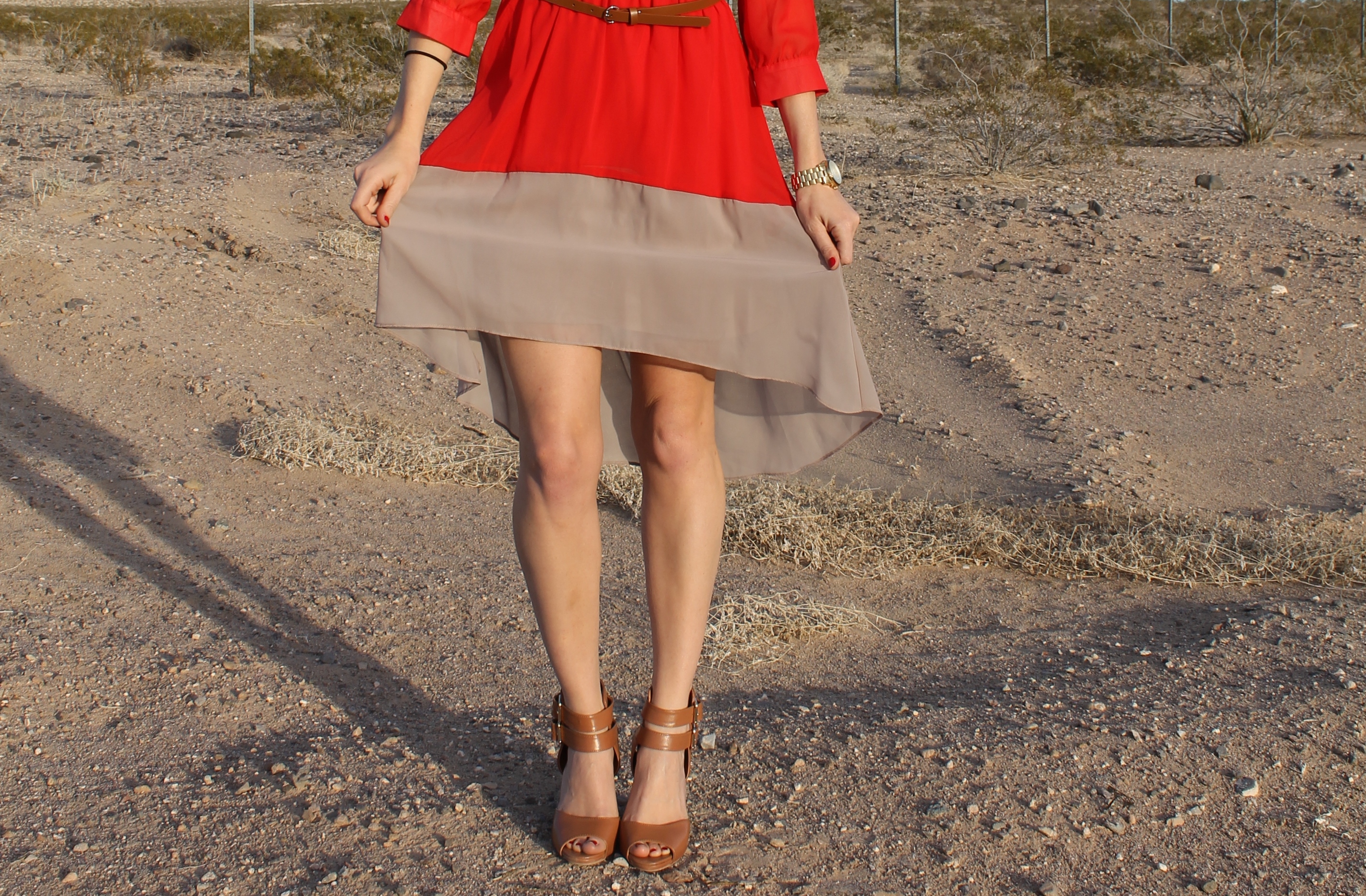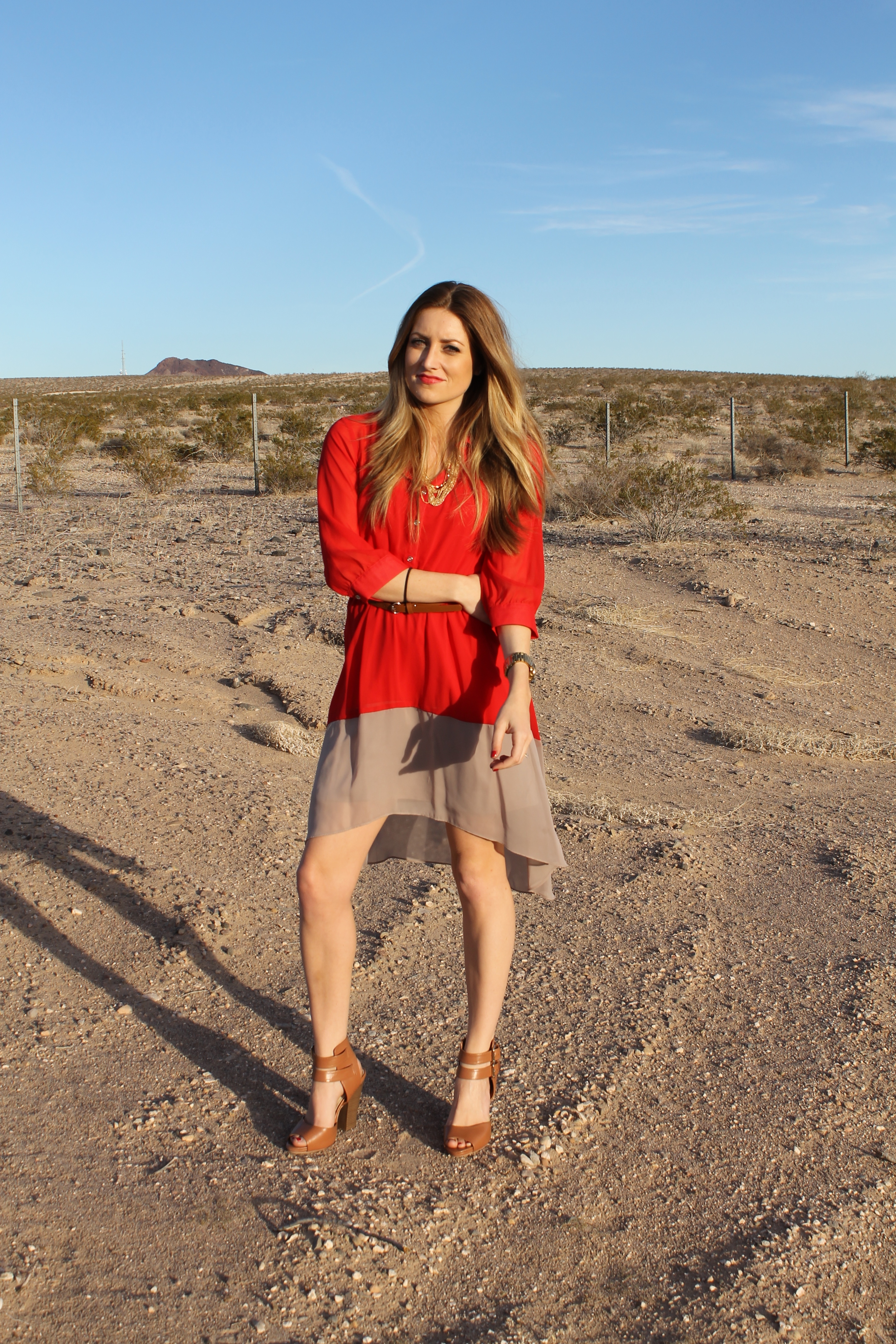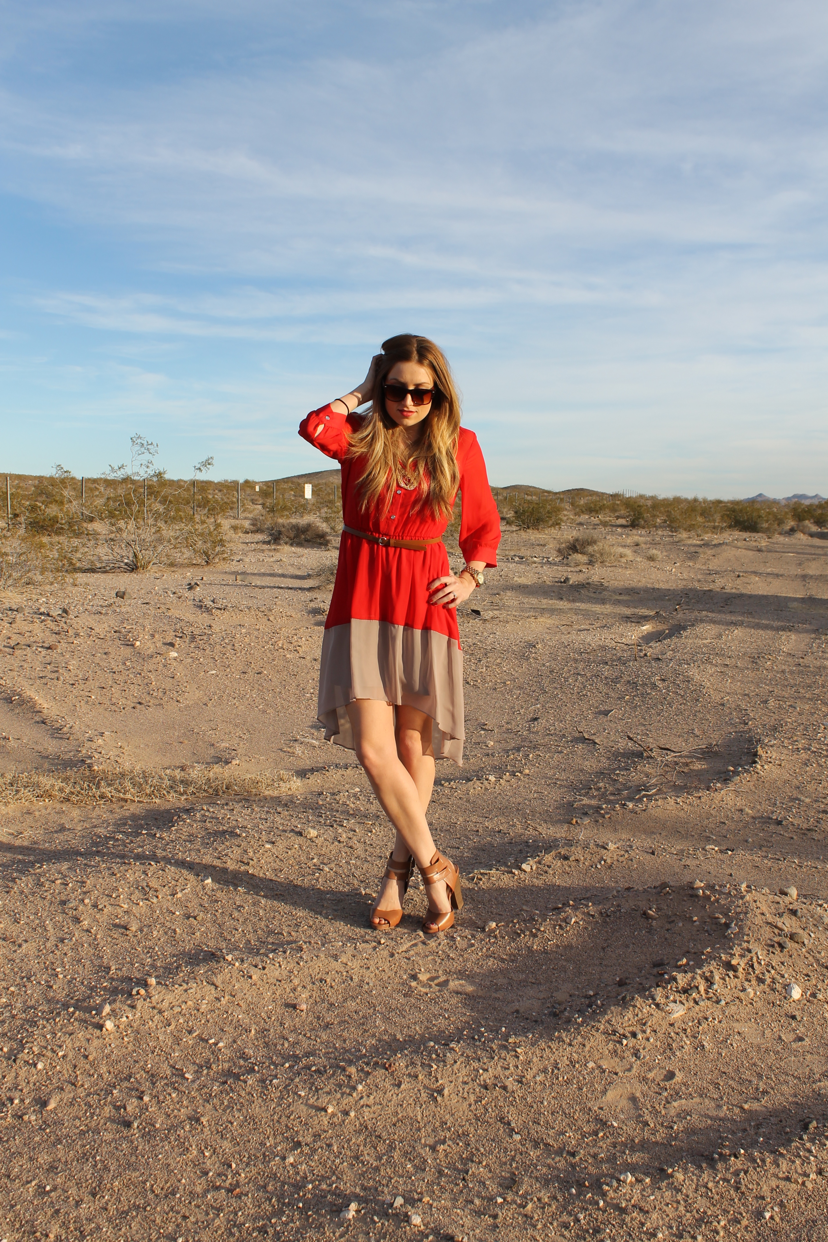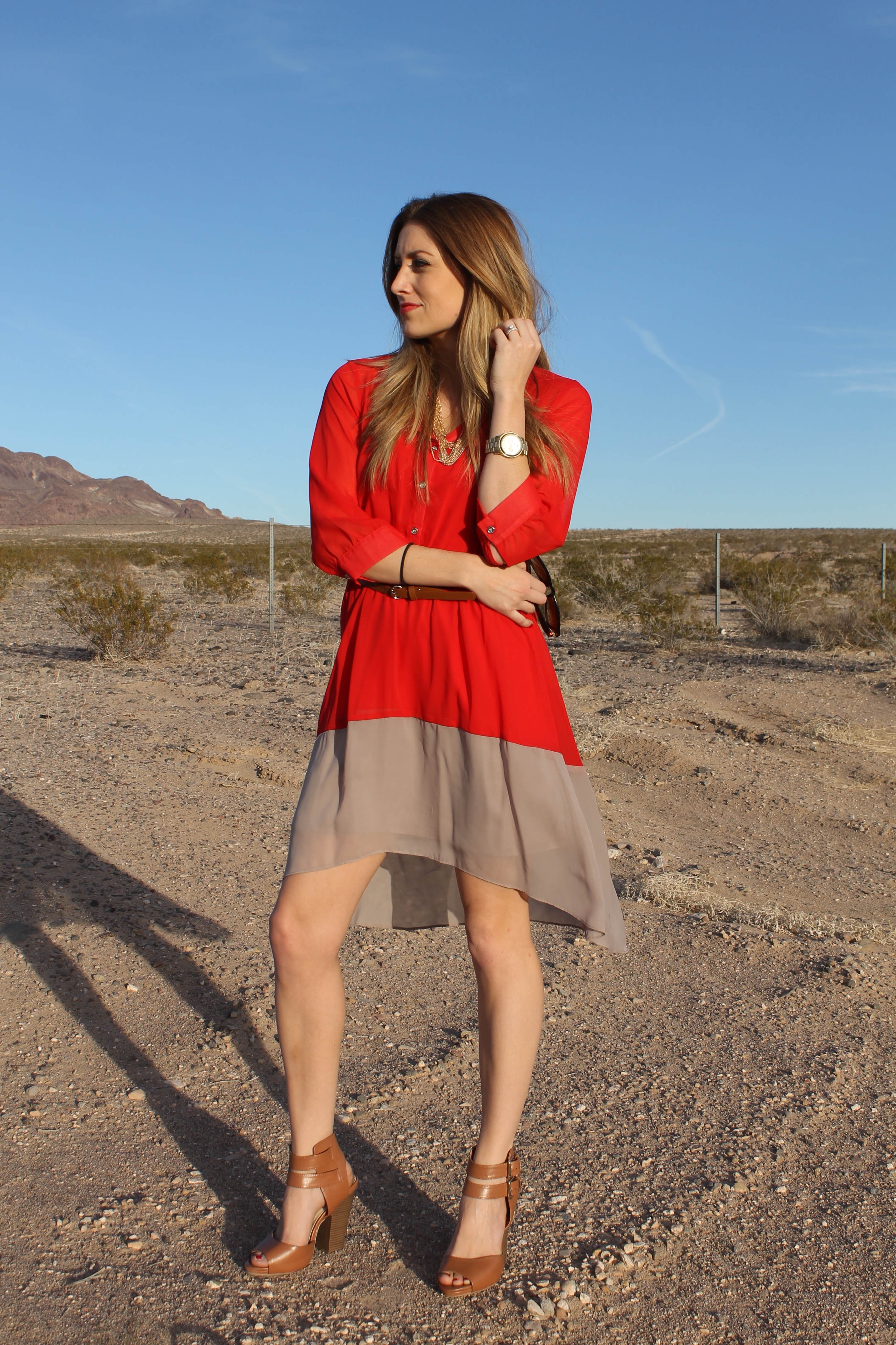 Andrew and I just got back from a weekend road trip! Our two main stops were Las Vegas and the Grand Canyon. I felt like we were in the car forever! We also brought our sweet pup along, so she kept me entertained! Stay tuned for lots of pictures from our trip. I managed to get Andrew to take some pictures along the way as well, which brings us to this little number. How pretty is this cherry red dress? I love the flirty feel and movement of high-low hems. The longer sleeves and collar keeps this dress from looking too summery. I hope you all are having a great holiday season. I am going to soak up some family time this weekend!