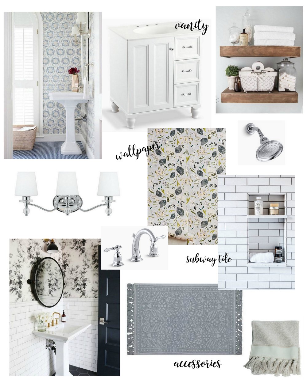 Hey guys! Today I wanted to share with you some ideas I have for our guest bath. We are going to completely gut it and re-do everything except the floors. I've ordered all the 'parts' like tub, faucet, toilet, mirror etc. We are just waiting for them to come in until we start on the demo. Once the tub is in I think we will start. The only thing not finalized is the wallpaper, light fixtures and accessories. We are planning on having the whole room subway tiled. In the shower it will go from the top of the tub up to the ceiling. Then the tile will extend all around the room going half way up the wall. I'll then have wallpaper on the upper part of the walls. I'm leaning towards some of the designs from Anthropologie but it's so hard! I want something with a little interest since everything else is basically white. Let me know if you have some wallpaper recommendations the comments. I'm so ready to get it all started. I'm really hoping we can have it done by the time the girls are born!