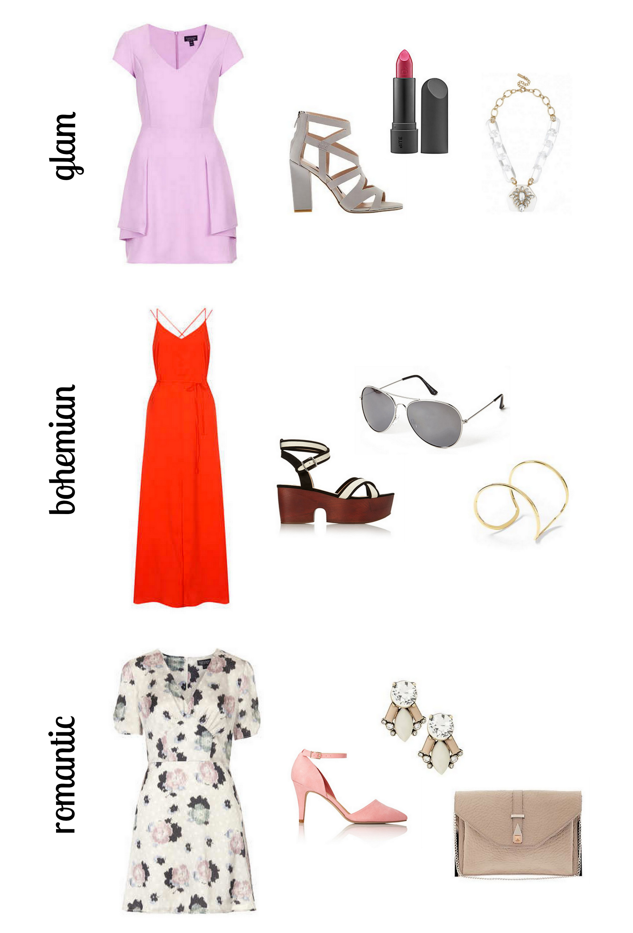 Wedding season is in full swing! I have been busy doing makeup for friends and family and have an awesome post on wedding makeup that will be up next month. As far as fashion goes, what you wear to a wedding is really dependent on each occasion. Some weddings are very laid back, and you can get away with a comfortable summer dress. However, sometimes you need to get slightly more dressed up, even though it is in the summer. Figure out where the wedding is taking place and what time it will be at, then go from there. If you are attending a day time wedding, dress on the casual side. Sunset ceremonies tend to be a little more formal. Make sure to have fun when picking out an outfit. Weddings are such happy occasions so you should feel comfortable in whatever you decide to wear! Here are three ideas on different styles you can go with.