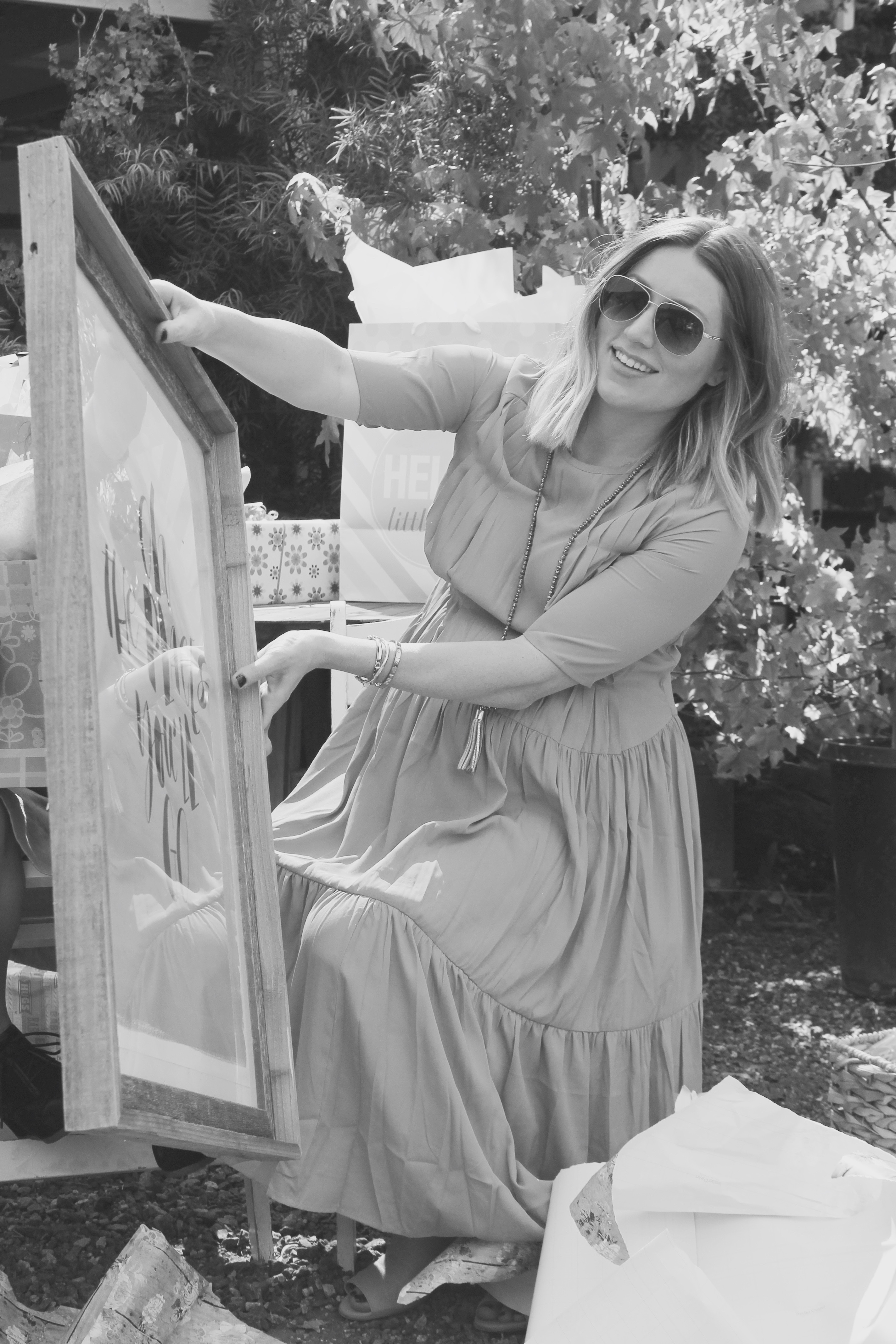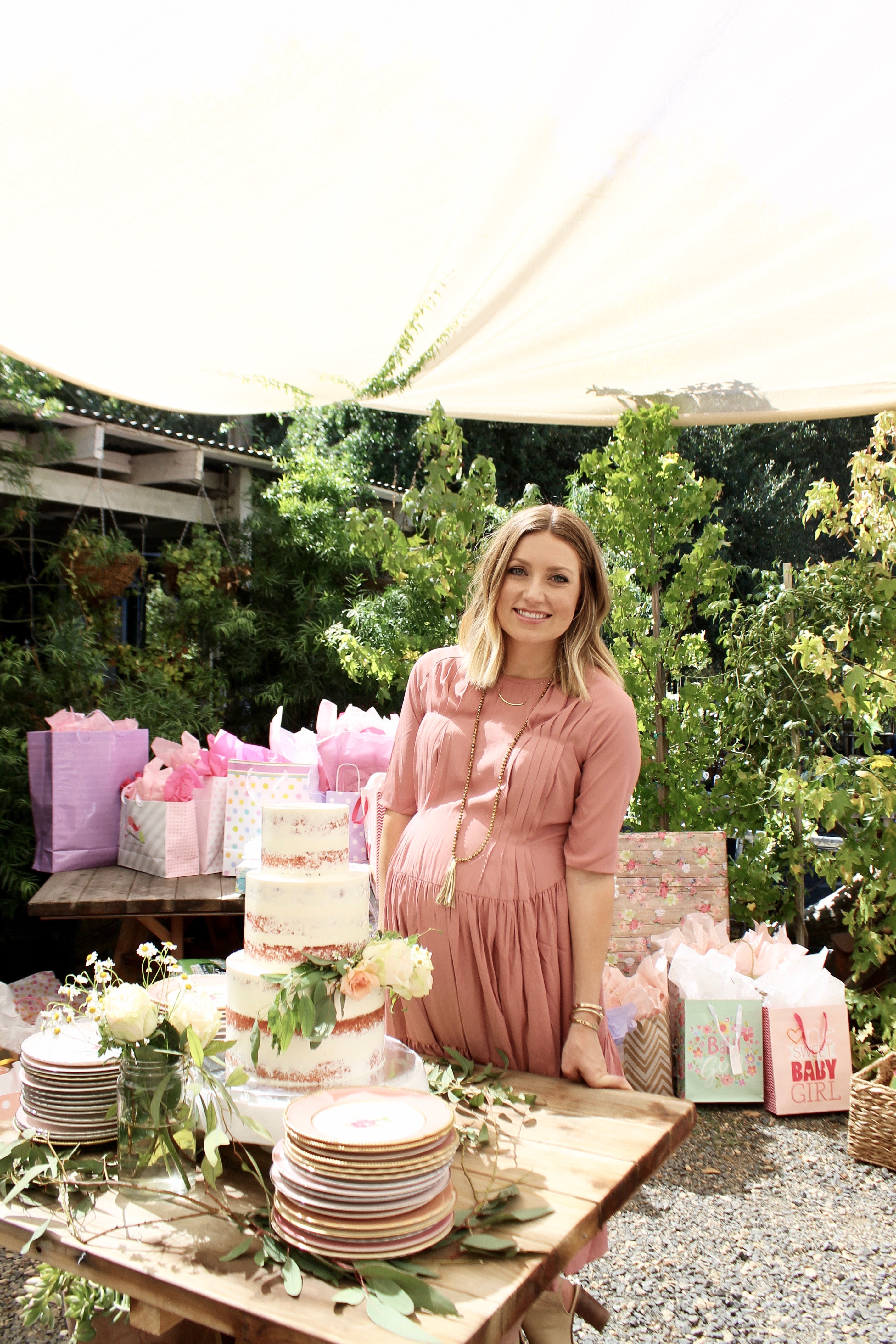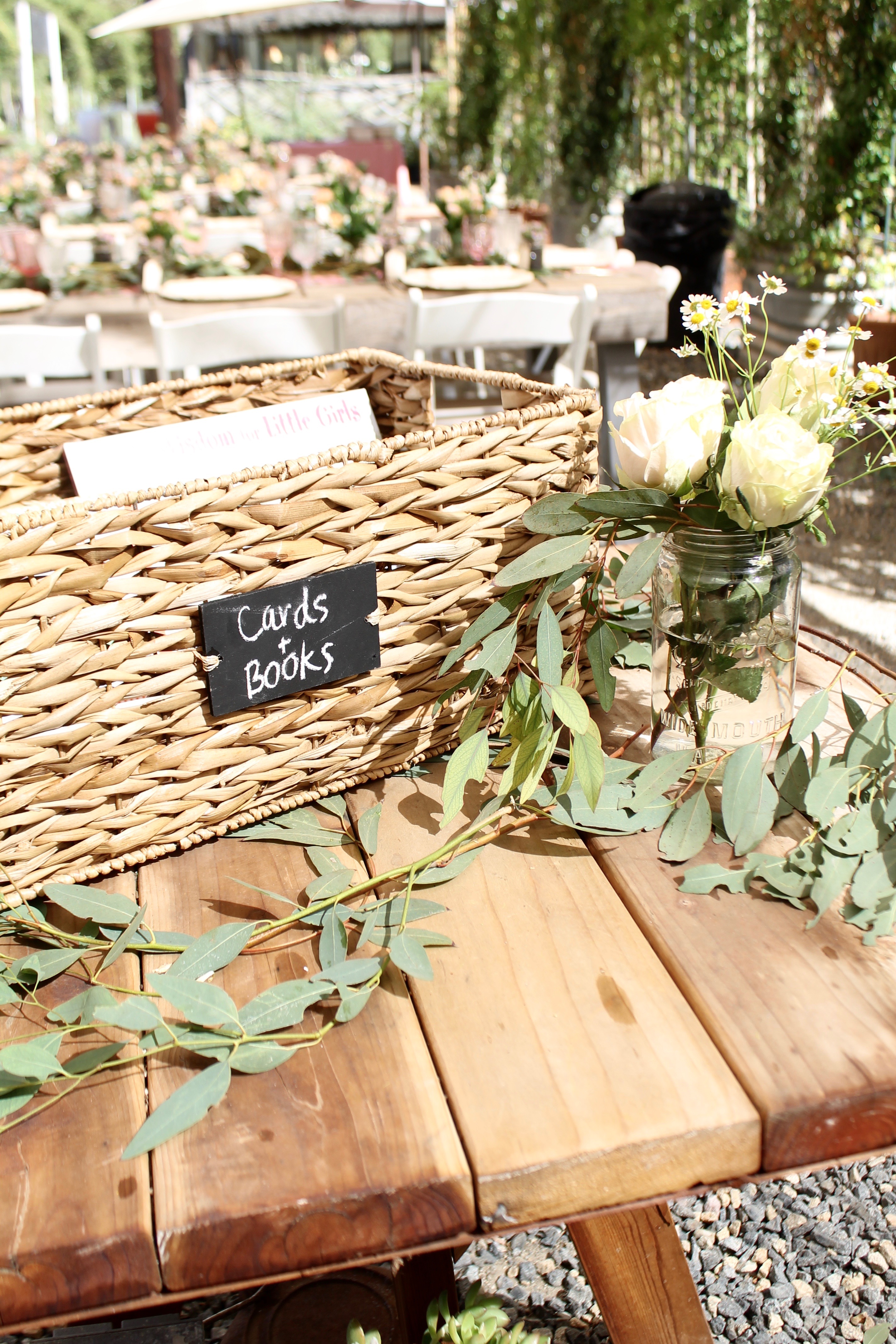 Finally I am here to share my baby shower photos with you all! It was such a beautiful (and hot) day with so much love! Our shower was held in Fallbrook, CA at Myrtle Creek Nursery. There was a tented area where we set everything up. But I’d recommend coming by this nursery for lunch sometime because it is such an adorable spot. You order lunch and it’s put in a picnic basket for you to take anywhere on the nursery to enjoy. We had around 45 people attend the shower from friends to family. The main thing I wanted was a romantic and rustic vibe, and it truly was just that. My mom found the pink table runners on amazon, and her and a friend made the plant party favors. The tags were from Etsy. Our plates, flatware and glassware were from Casa de Perrin and completely made the tables! My dad cut a ton of eucalyptus from their backyard and we used that on top of the runners along with homemade flower arrangements in mason jars.