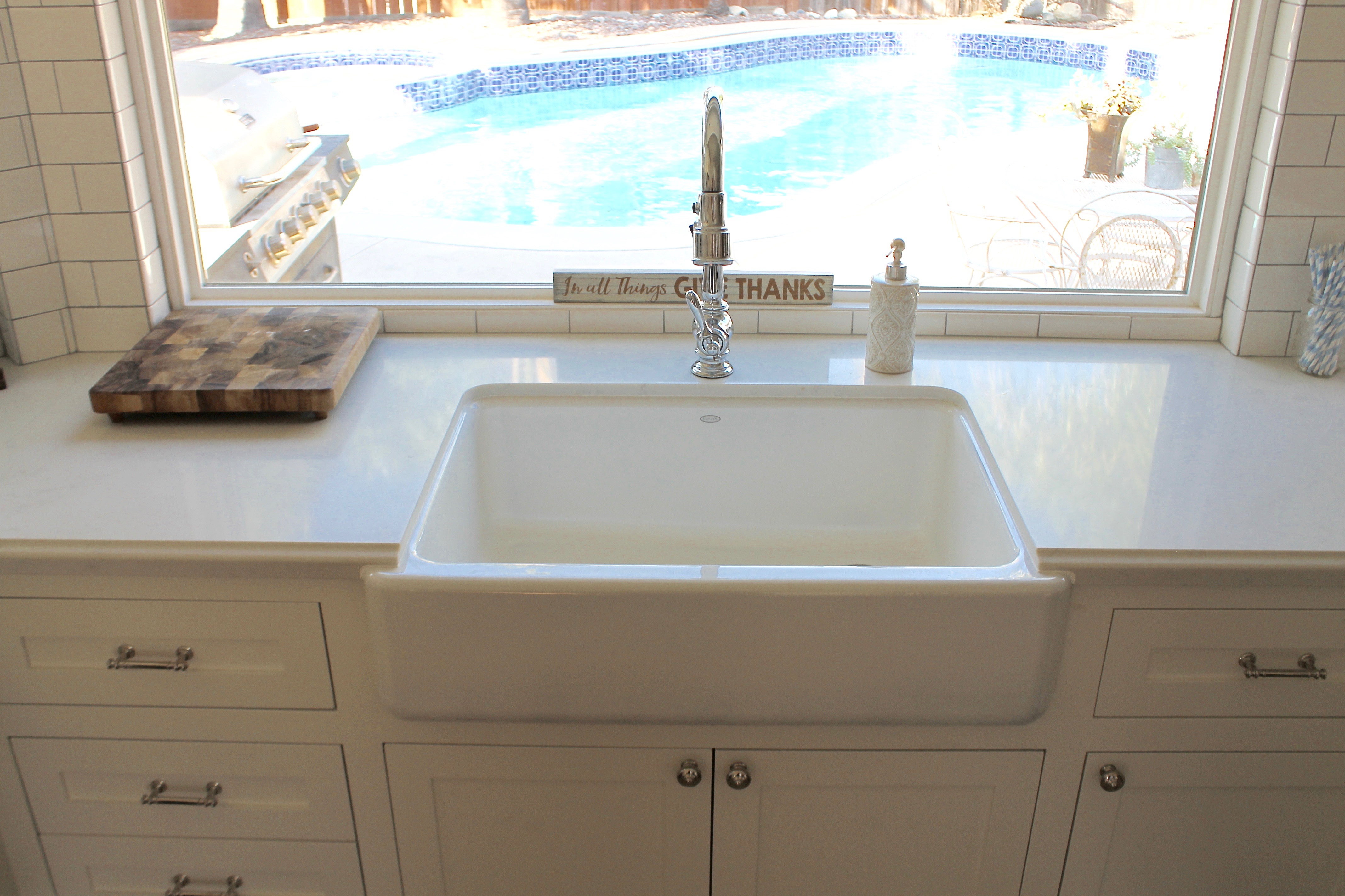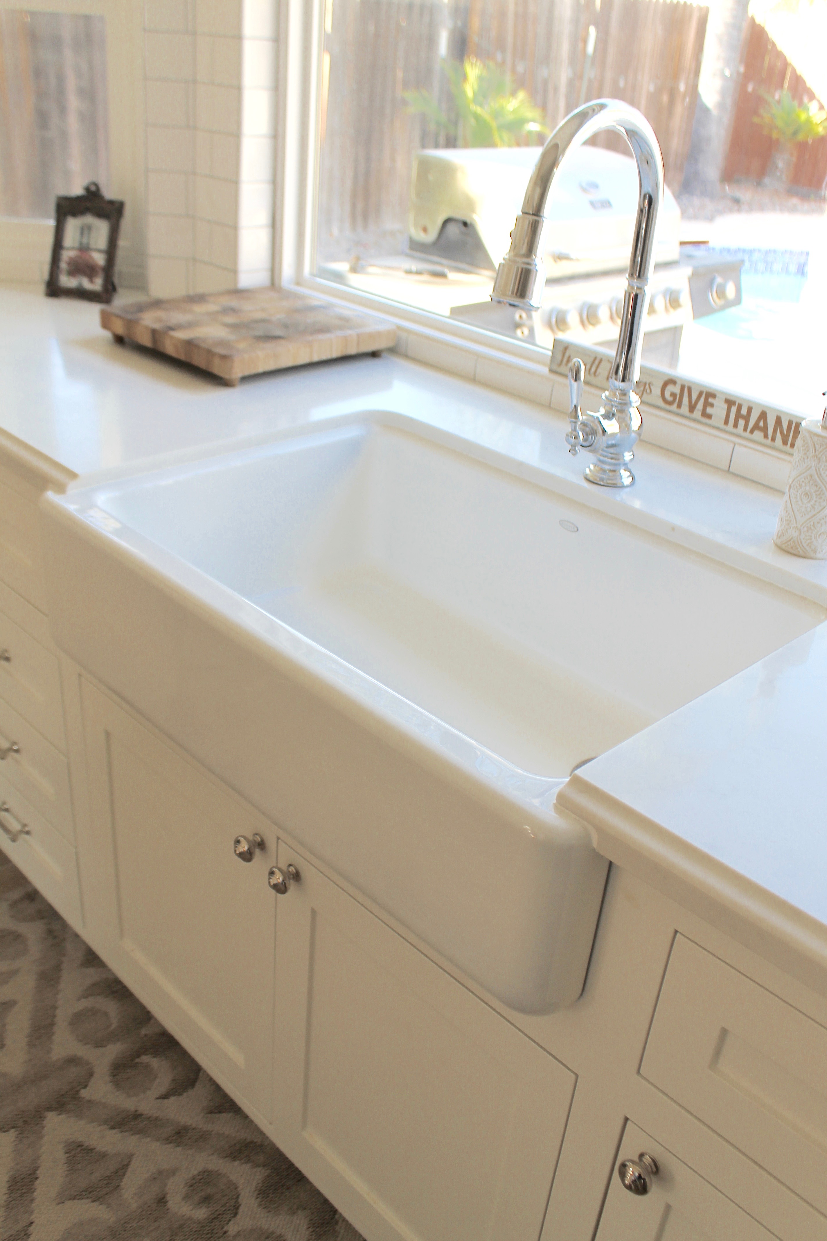 Like I mentioned in my part 1 of the reno, our sink (32 in.) and faucet are both from Kohler. Everyday I love them more and more. The faucet is not only beautiful, but it is so functional. It has an extendable spout and three different settings (normal, spray and one that cleans the bottom of the sink out). I’m really happy I went with an apron front sink. I love how wide it is so I can fit all my pans in it completely and I swear I enjoy cleaning our dishes more now!
