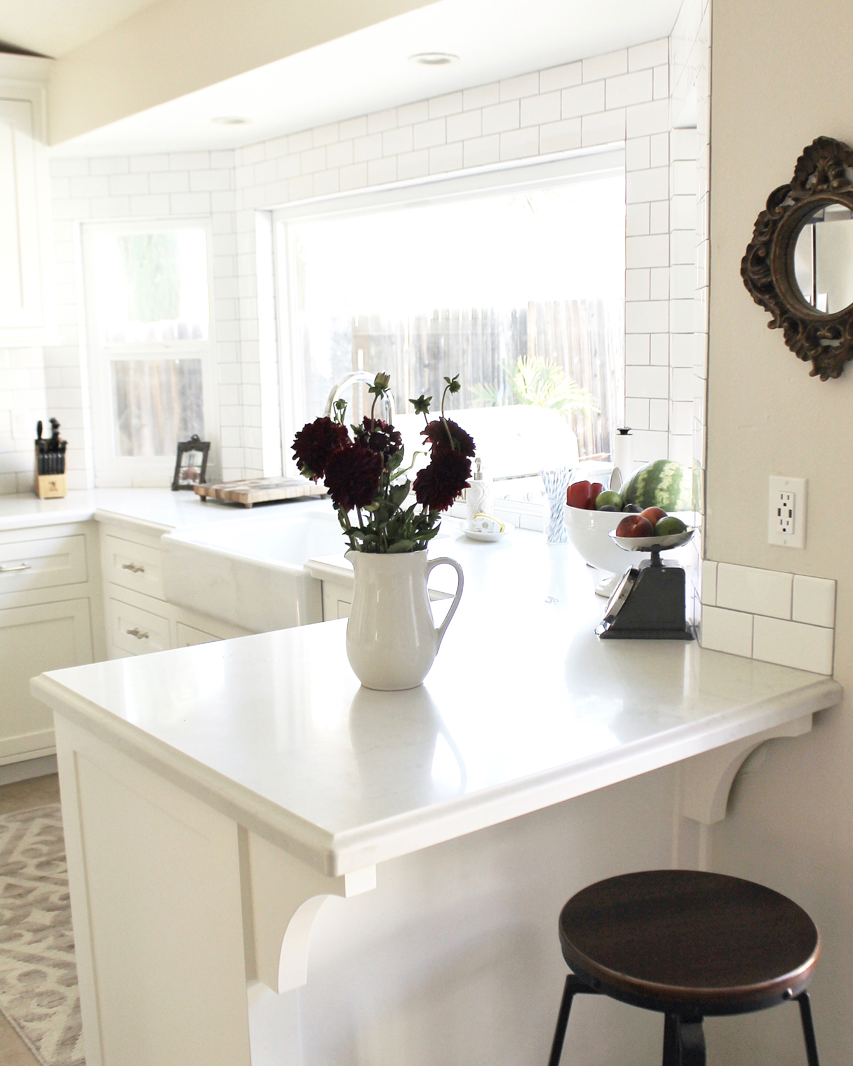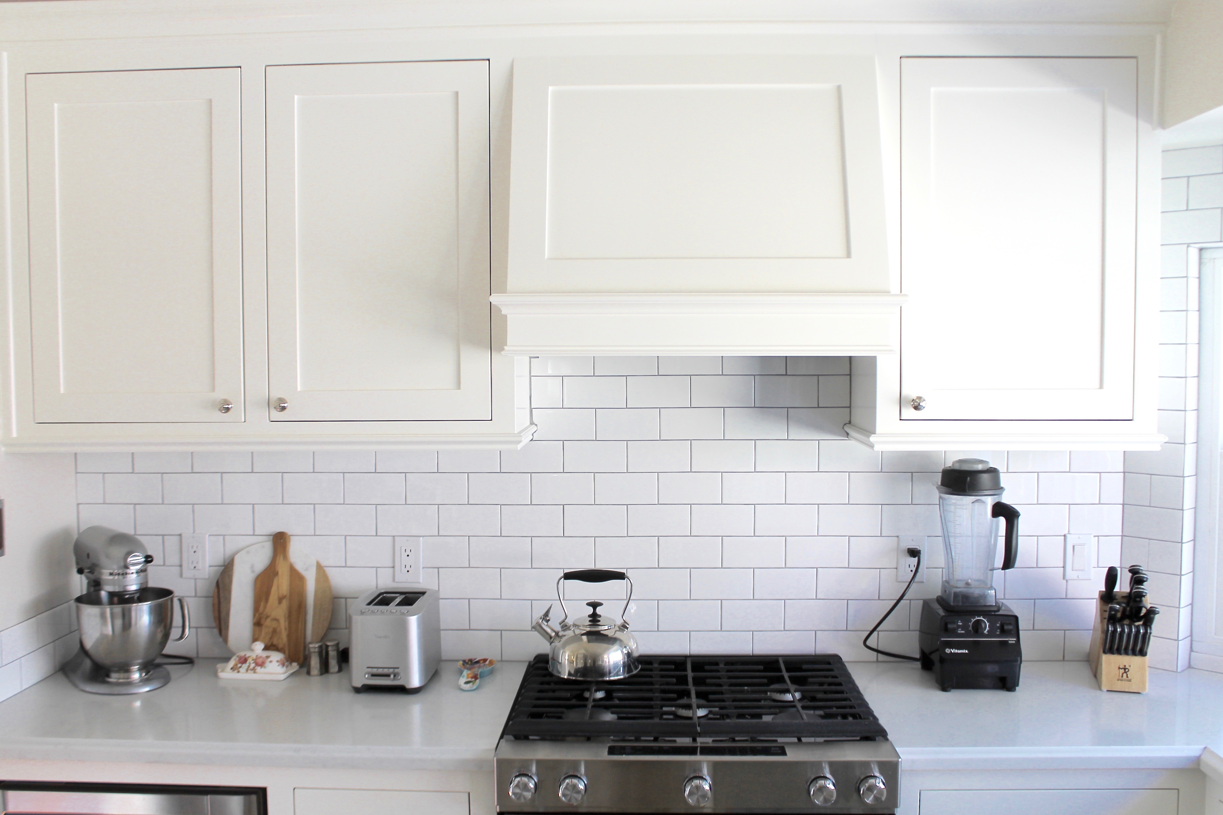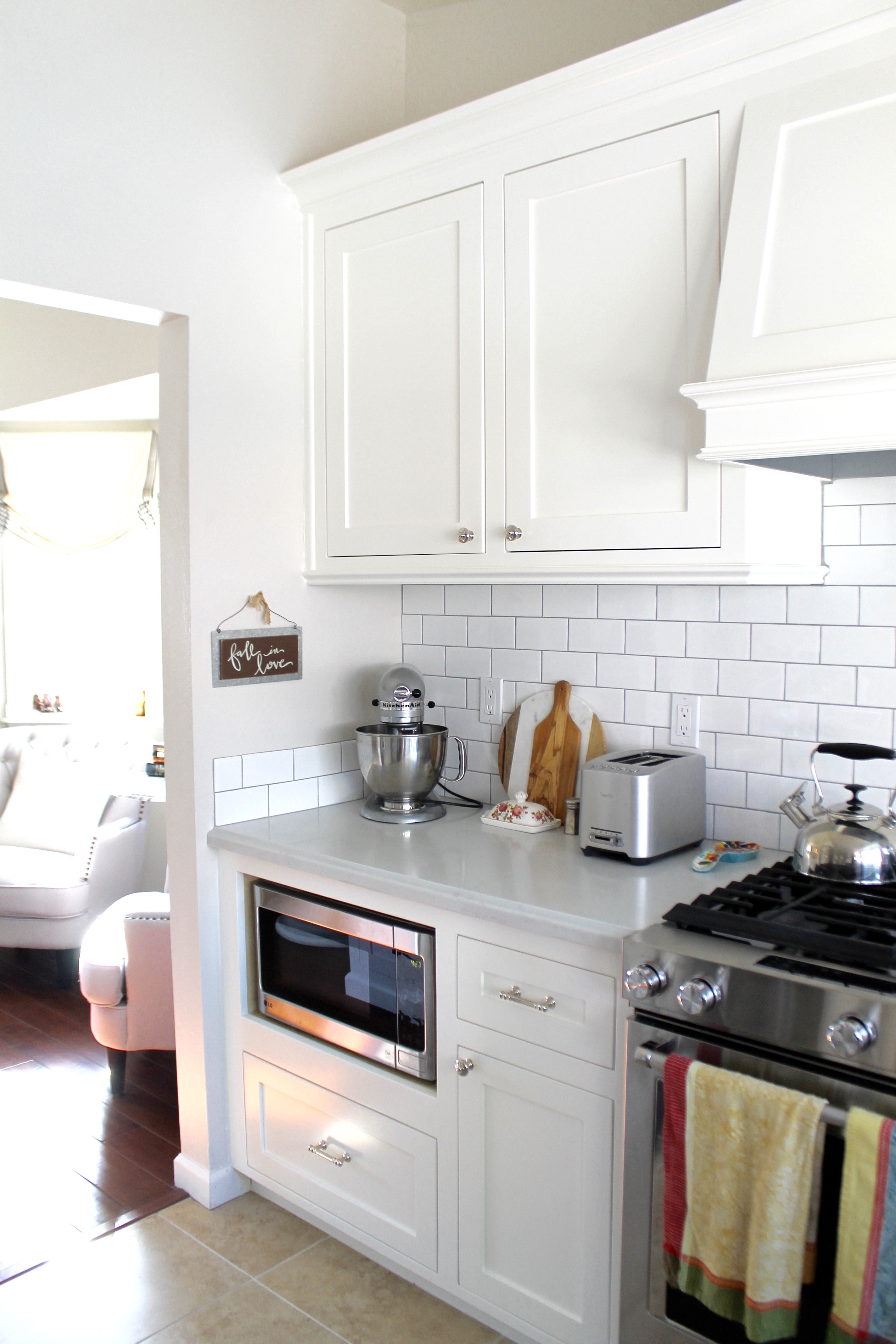 Our cabinets are painted with Behr Swiss Coffee (semi-gloss), which is the color of our trim all throughout the house. When they first painted it I thought it looked so bright. But once the backsplash was installed (which is a bright white), the cabinets actually look much more creamy. The counters also look more grey no with everything completed. The counters are quartz and the color is New Carrara from Arizona Tile. We chose to use two slabs because I wasn’t a fan of pre-fab color options. Also, I don’t know if you remember, but we used to have a giant pantry to the left of the stove. We decided we’d rather have more counter space, so we extended the countertops to the wall. Now I use that space so much and I don’t even miss the pantry. Instead we have our spices, baking supplies, vitamins and other things in the two doors to the left of the over. We have all our canned goods and snacks in the drawer below the microwave.