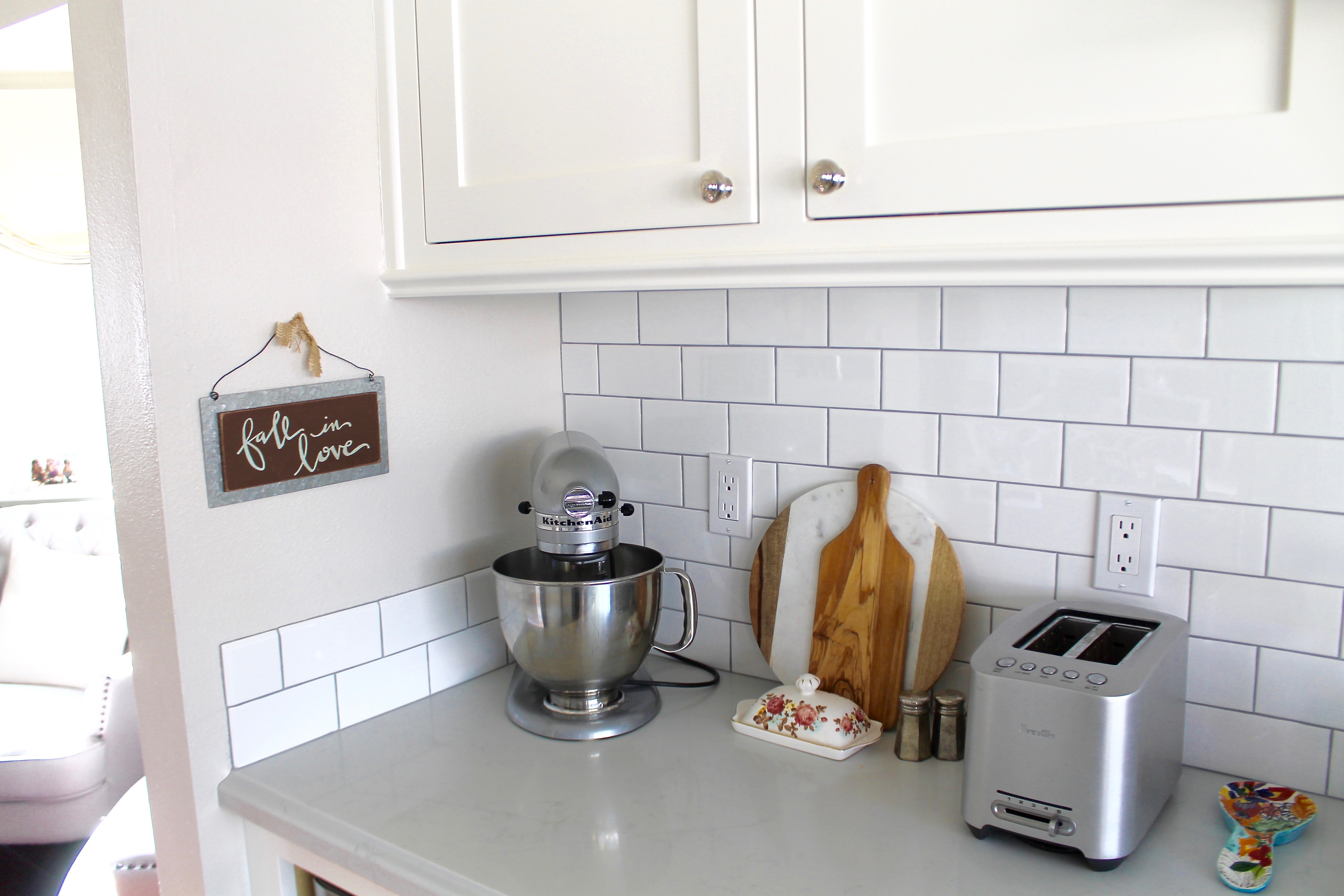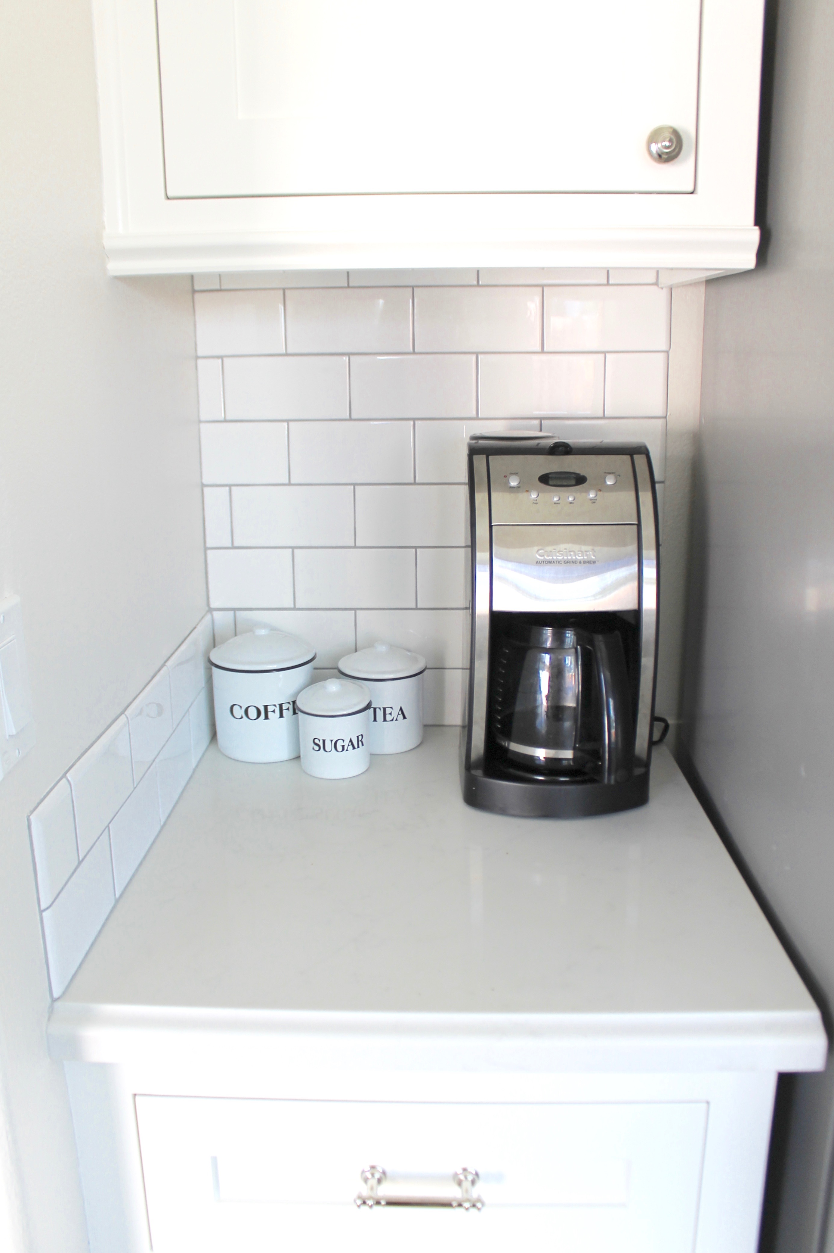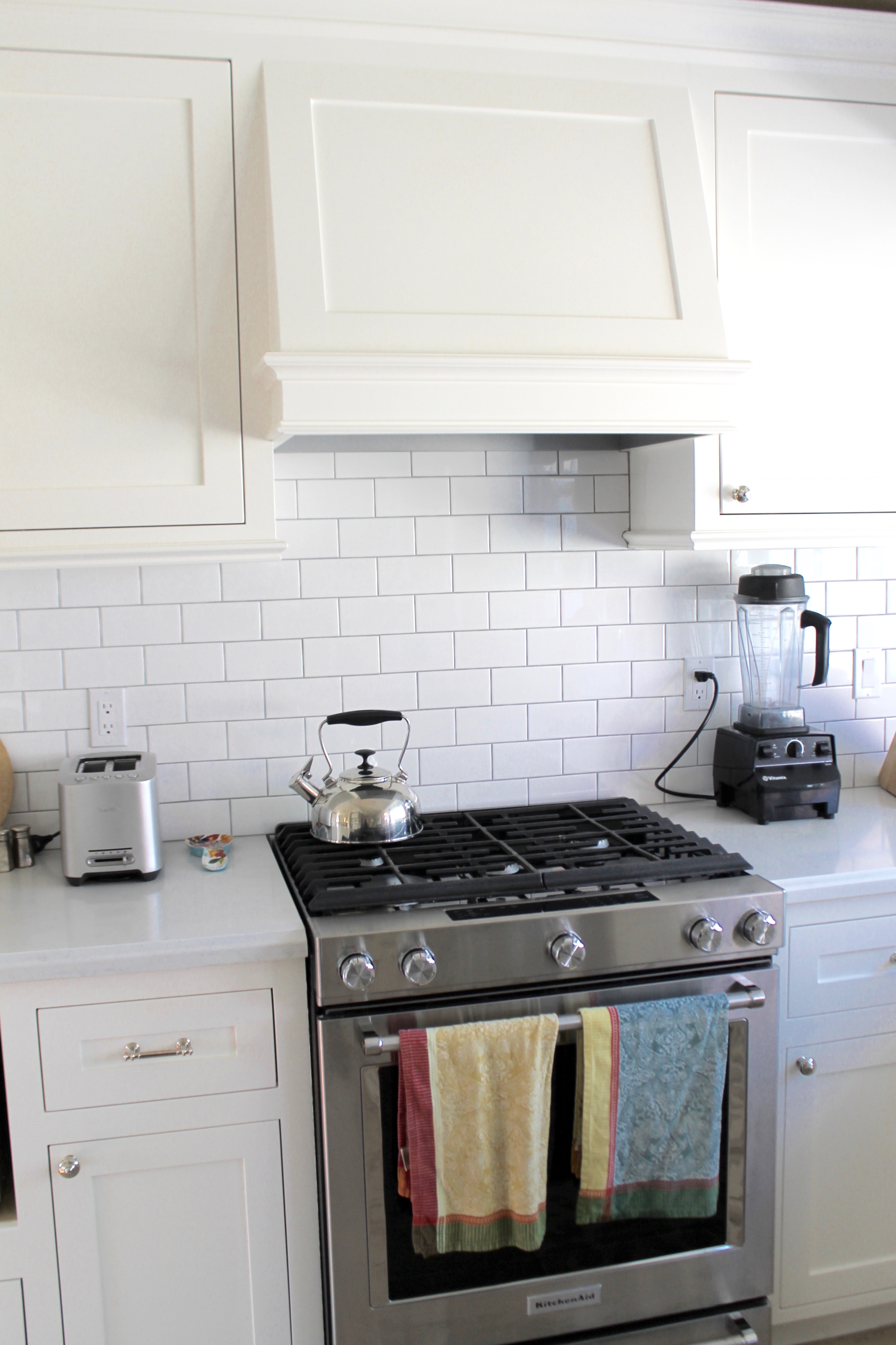 Our cabinets are painted with Behr Swiss Coffee (semi-gloss), which is the color of our trim all throughout the house. When they first painted it I thought it looked so bright. But once the backsplash was installed (which is a bright white), the cabinets actually look much more creamy. The counters also look more grey no with everything completed. The counters are quartz and the color is New Carrara from Arizona Tile. We chose to use two slabs because I wasn’t a fan of pre-fab color options. Also, I don’t know if you remember, but we used to have a giant pantry to the left of the stove. We decided we’d rather have more counter space, so we extended the countertops to the wall. Now I use that space so much and I don’t even miss the pantry. Instead we have our spices, baking supplies, vitamins and other things in the two doors to the left of the over. We have all our canned goods and snacks in the drawer below the microwave.