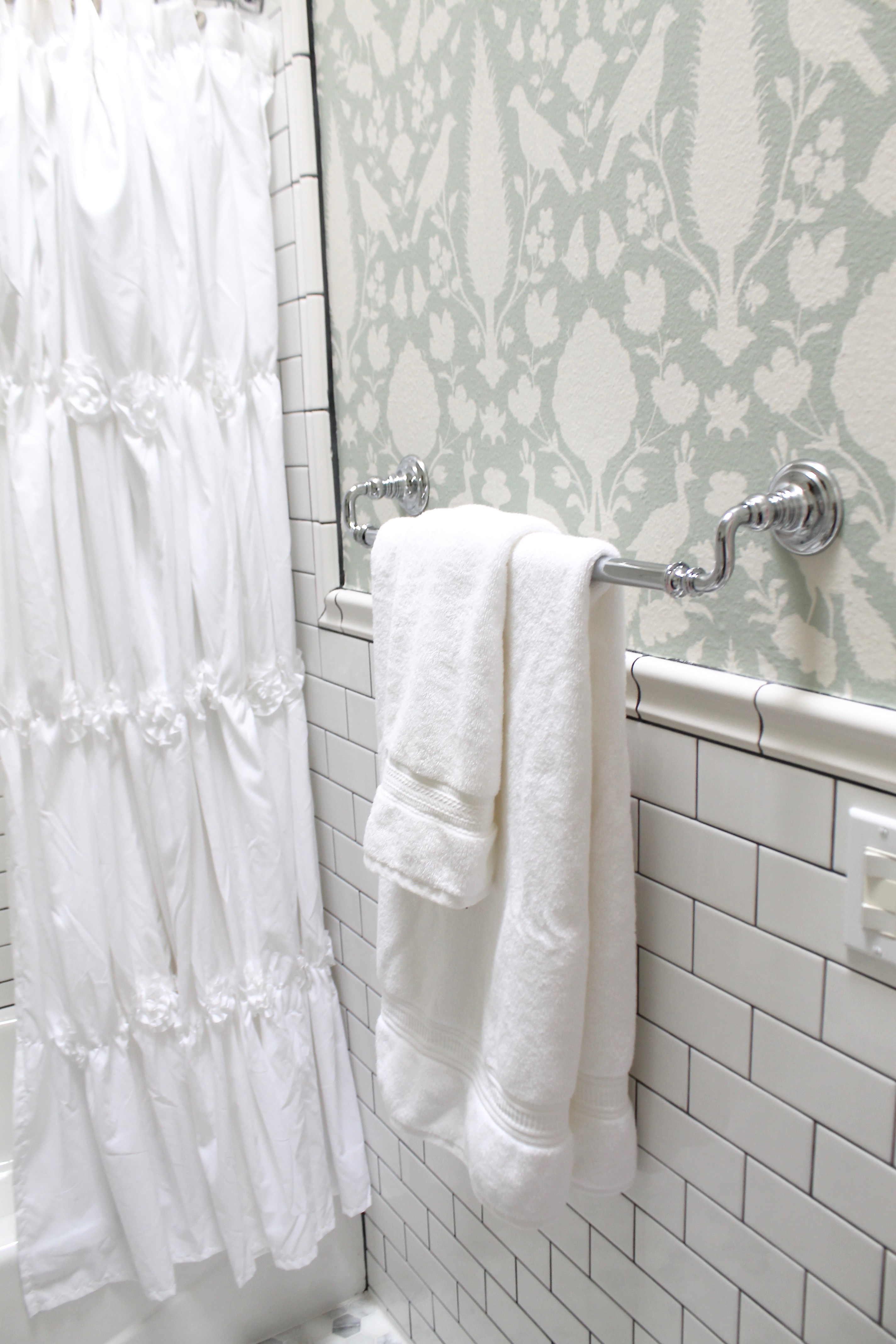 Hey guys! Today I wanted to share with you some ideas I have for our guest bath. We are going to completely gut it and re-do everything except the floors. I’ve ordered all the ‘parts’ like tub, faucet, toilet, mirror etc. We are just waiting for them to come in until we start on the demo. Once the tub is in I think we will start. The only thing not finalized is the wallpaper, light fixtures and accessories. We are planning on having the whole room subway tiled. In the shower it will go from the top of the tub up to the ceiling. Then the tile will extend all around the room going half way up the wall. I’ll then have wallpaper on the upper part of the walls. I’m leaning towards some of the designs from Anthropologie but it’s so hard! I want something with a little interest since everything else is basically white. Let me know if you have some wallpaper recommendations the comments. I’m so ready to get it all started. I’m really hoping we can have it done by the time the girls are born!