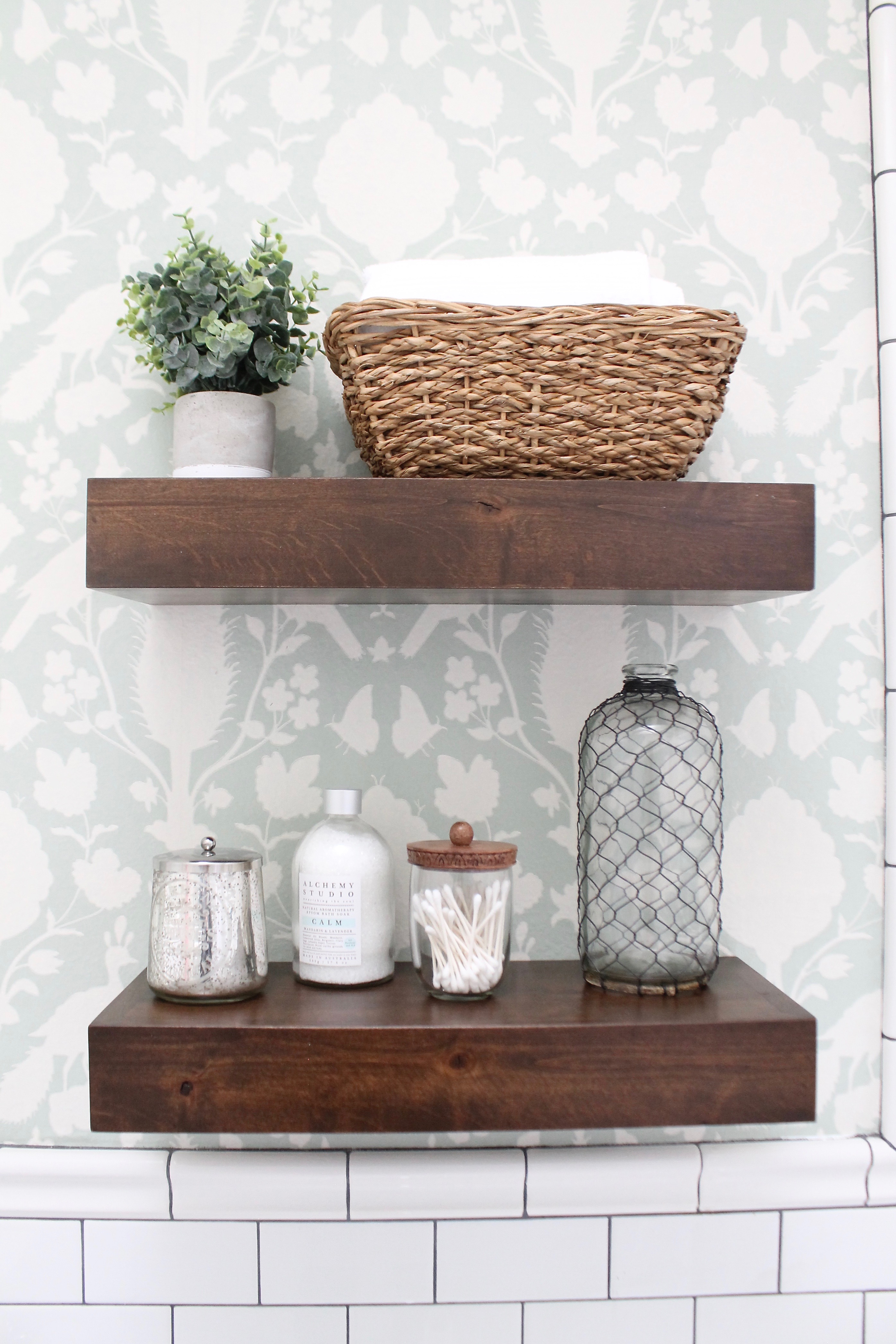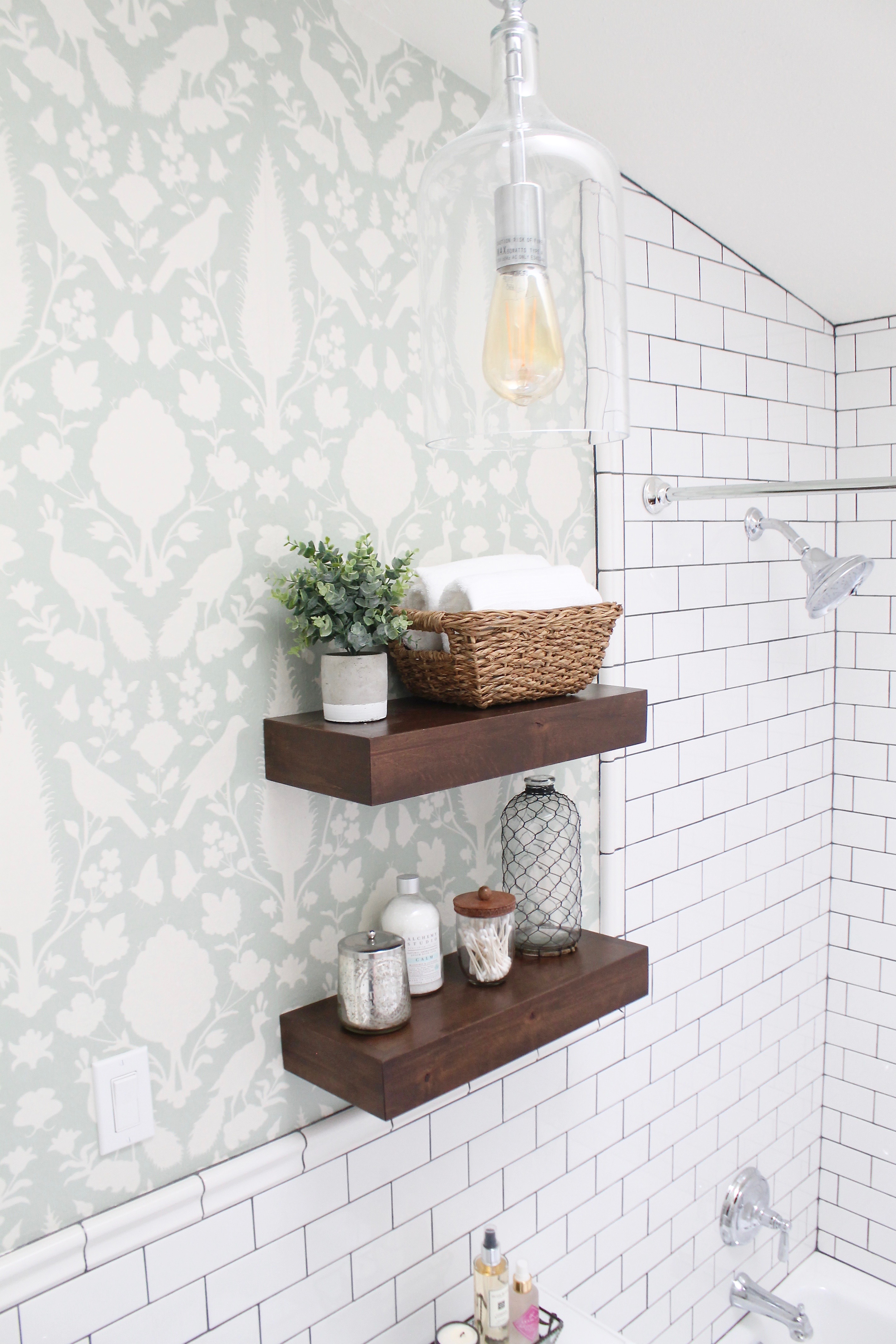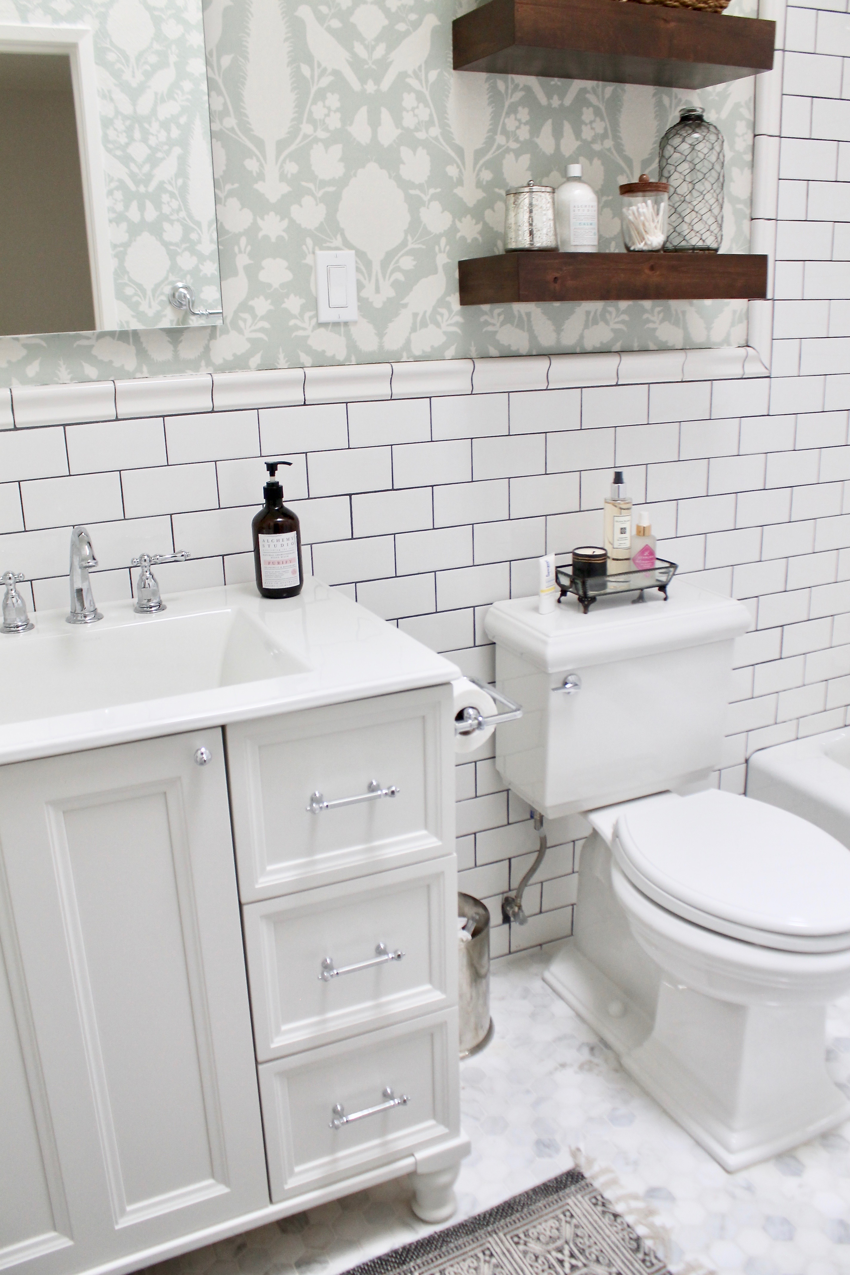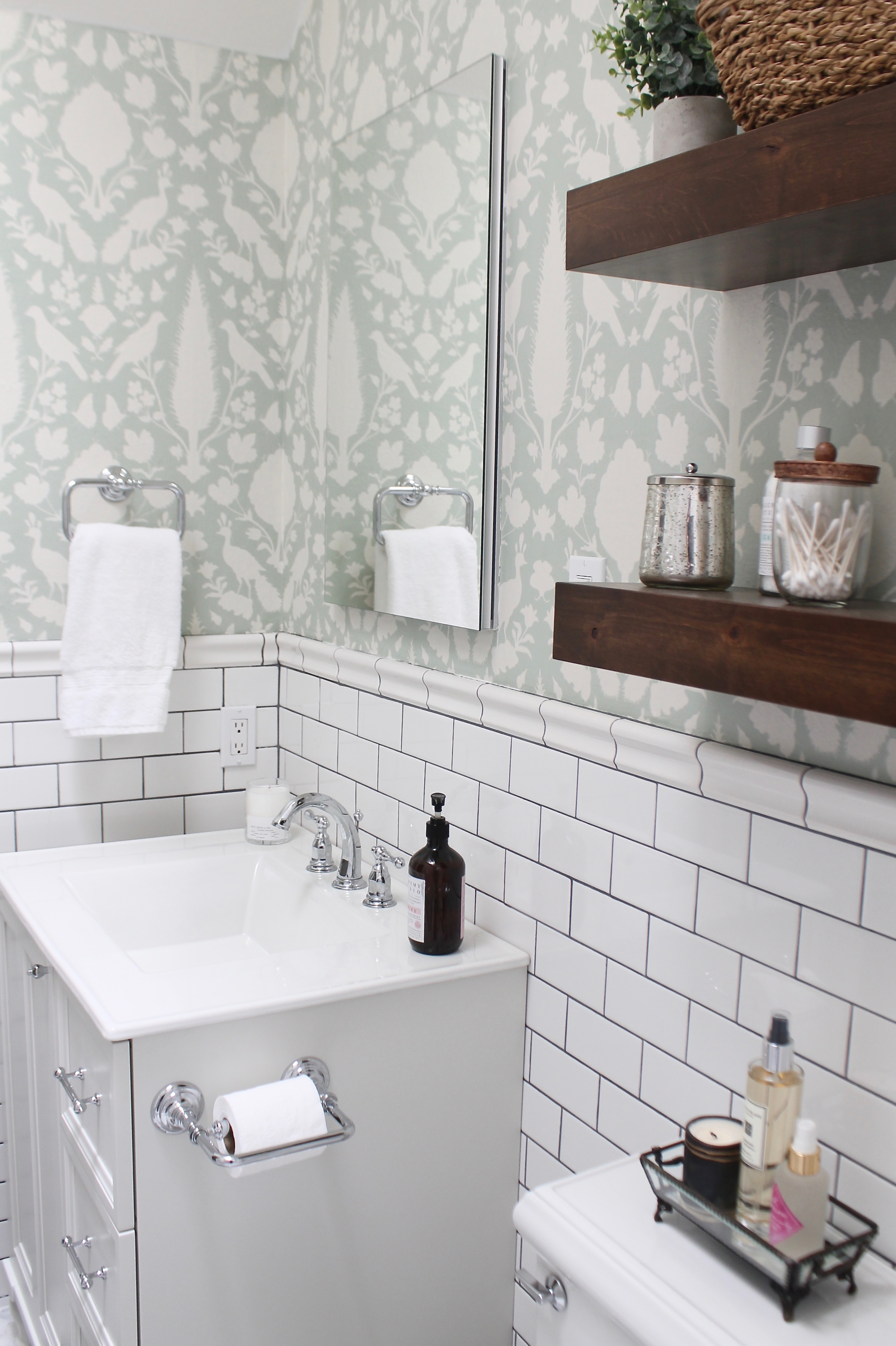 ^^Our Verdera Medicine Cabinet is one of my favorite features of the room. We had the piece installed in the wall so it doesn’t even stick out too far, yet we still have a ton of storage inside. It is clean and simple and I love how the wallpaper reflects in it.^^ ^^Right now I have it full of beauty products and baby things. I love having options for guests when they come to visit.^^ ^^The sink is called Ceramic Impressions and it has been so easy to clean. I also have been loving the vanity. It is real wood and has soft close doors which really fit a lot inside.^^^^Floating shelves were on our must-have list. I knew that there would be a lot of white so I wanted a wooden element to break it up and bring a little warmth to the space. We had a friend of ours make these for us. I just showed him similar styles that I had seen on Pinterest.^^ ^^The shower is such a transformation. Before it looked much smaller. Extending the subway tile all the way to the ceiling really helps to make the bathroom look larger. I also had a little nook installed for extra storage of shampoo and conditioners.^^