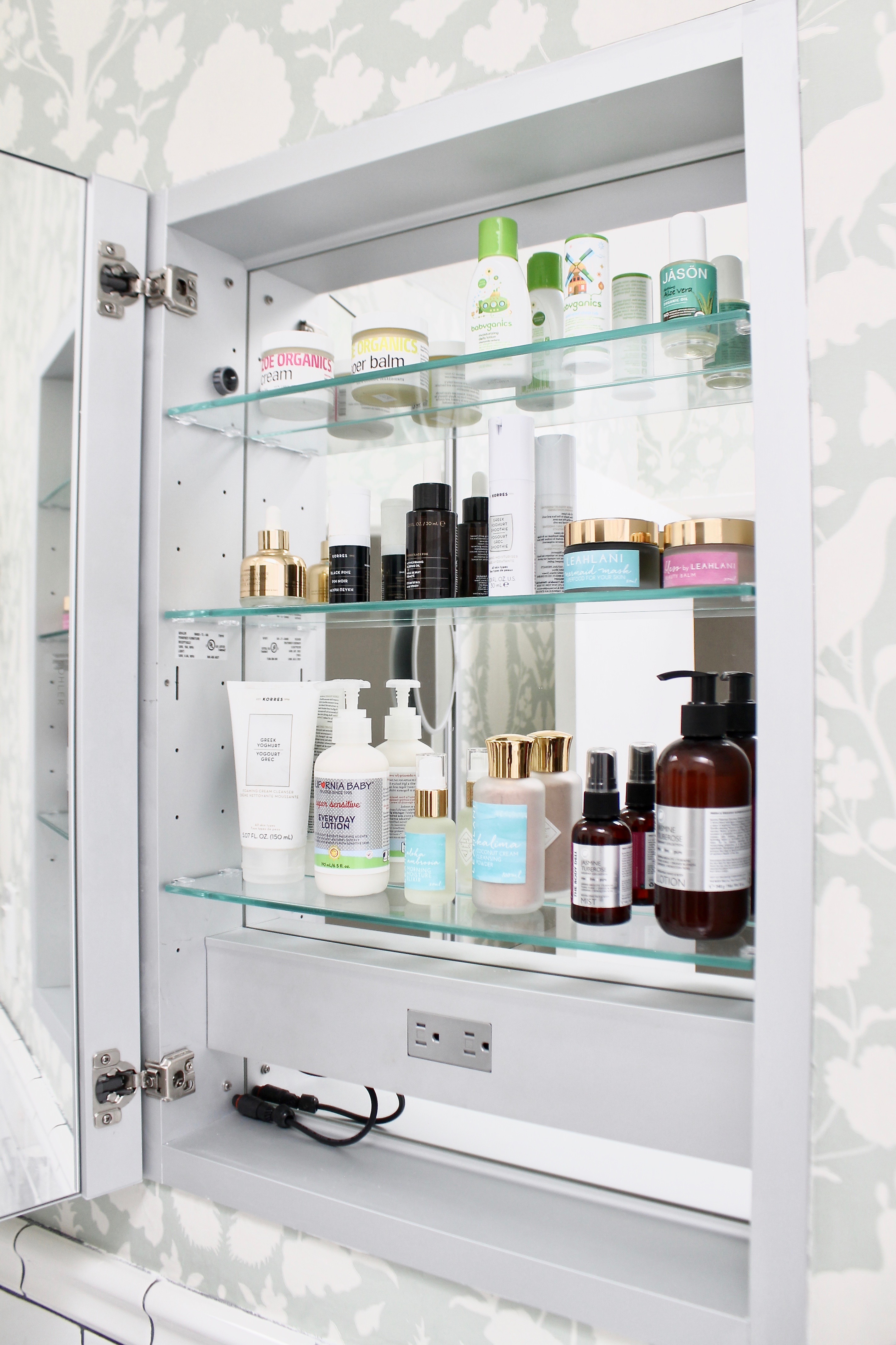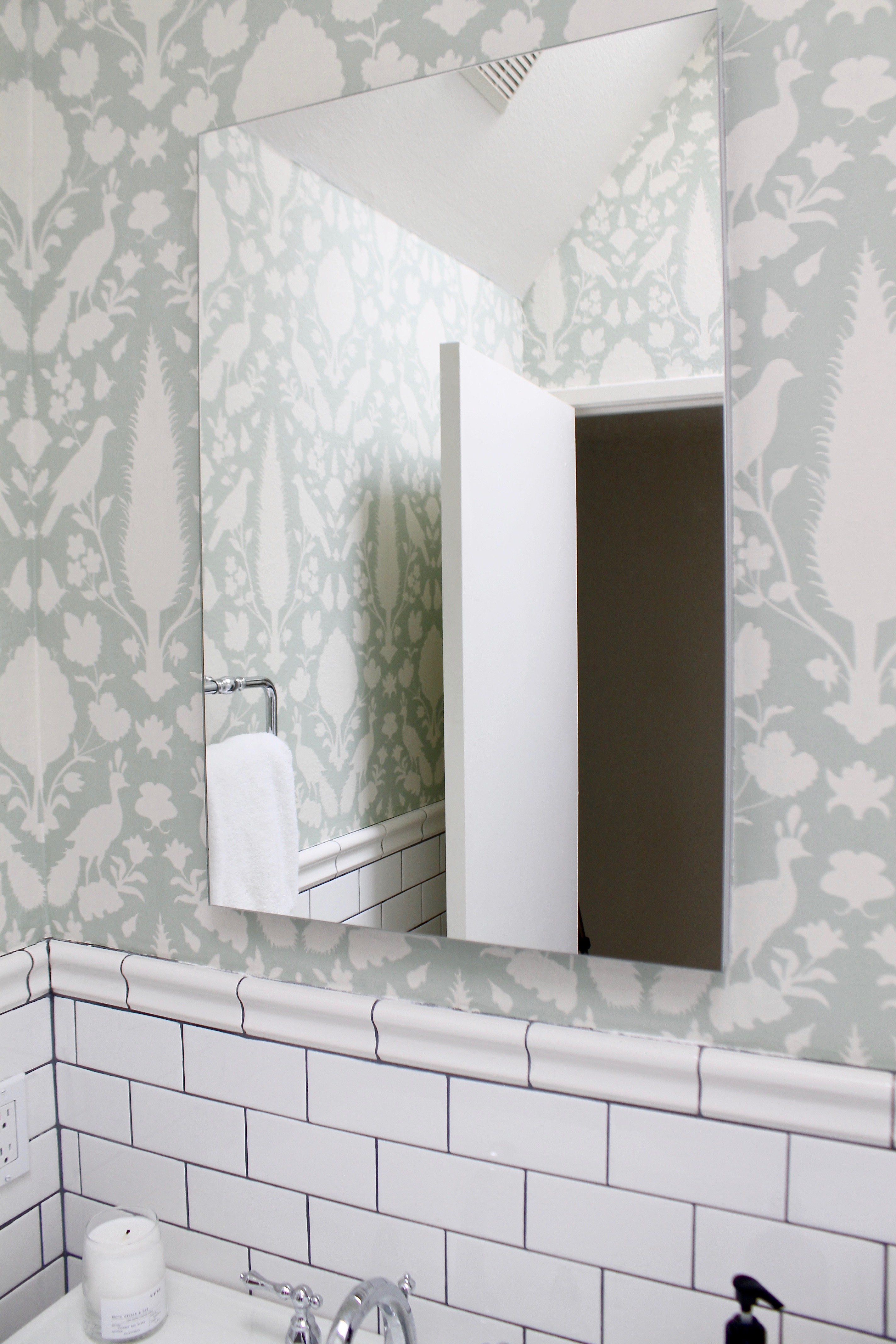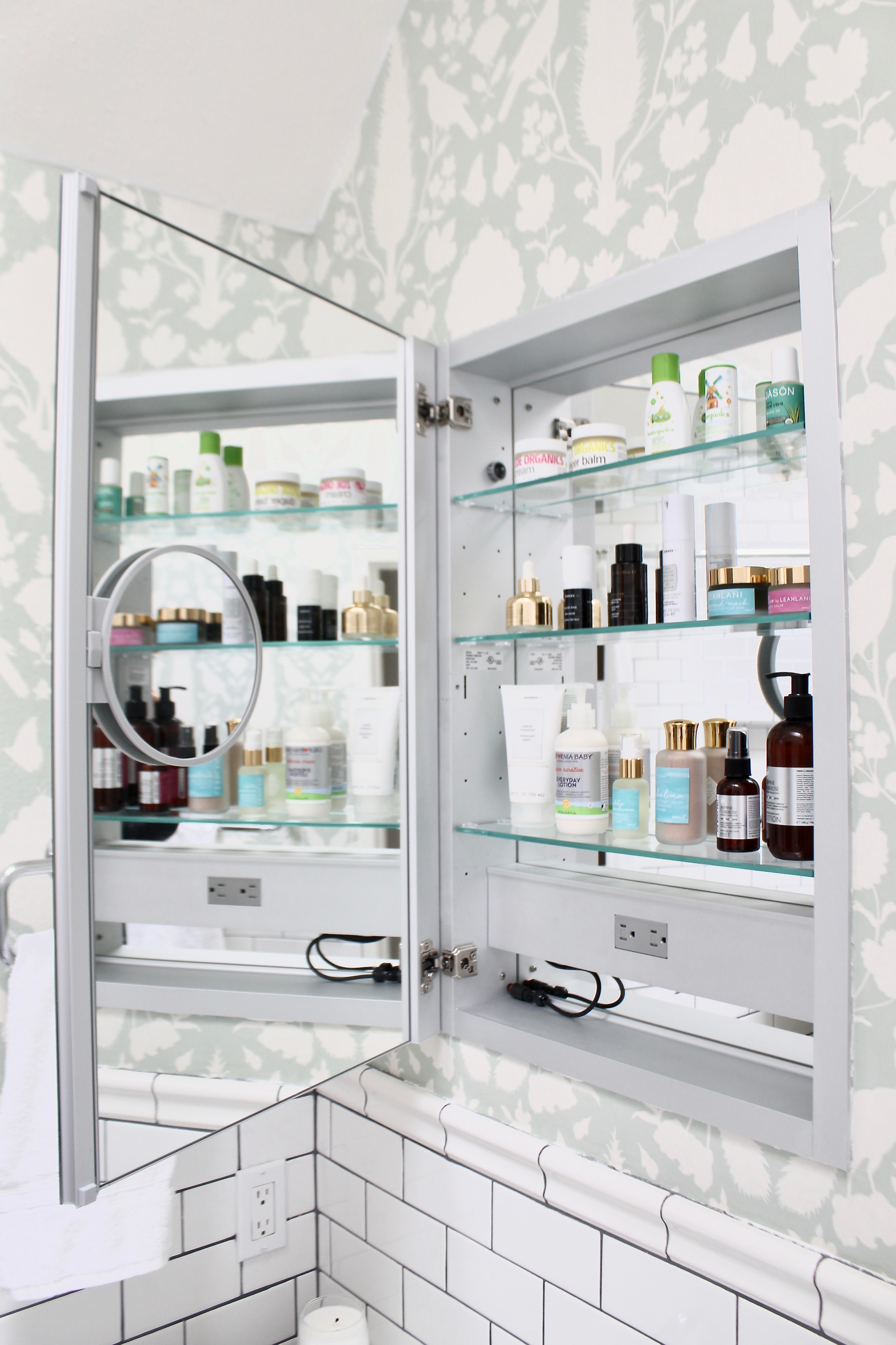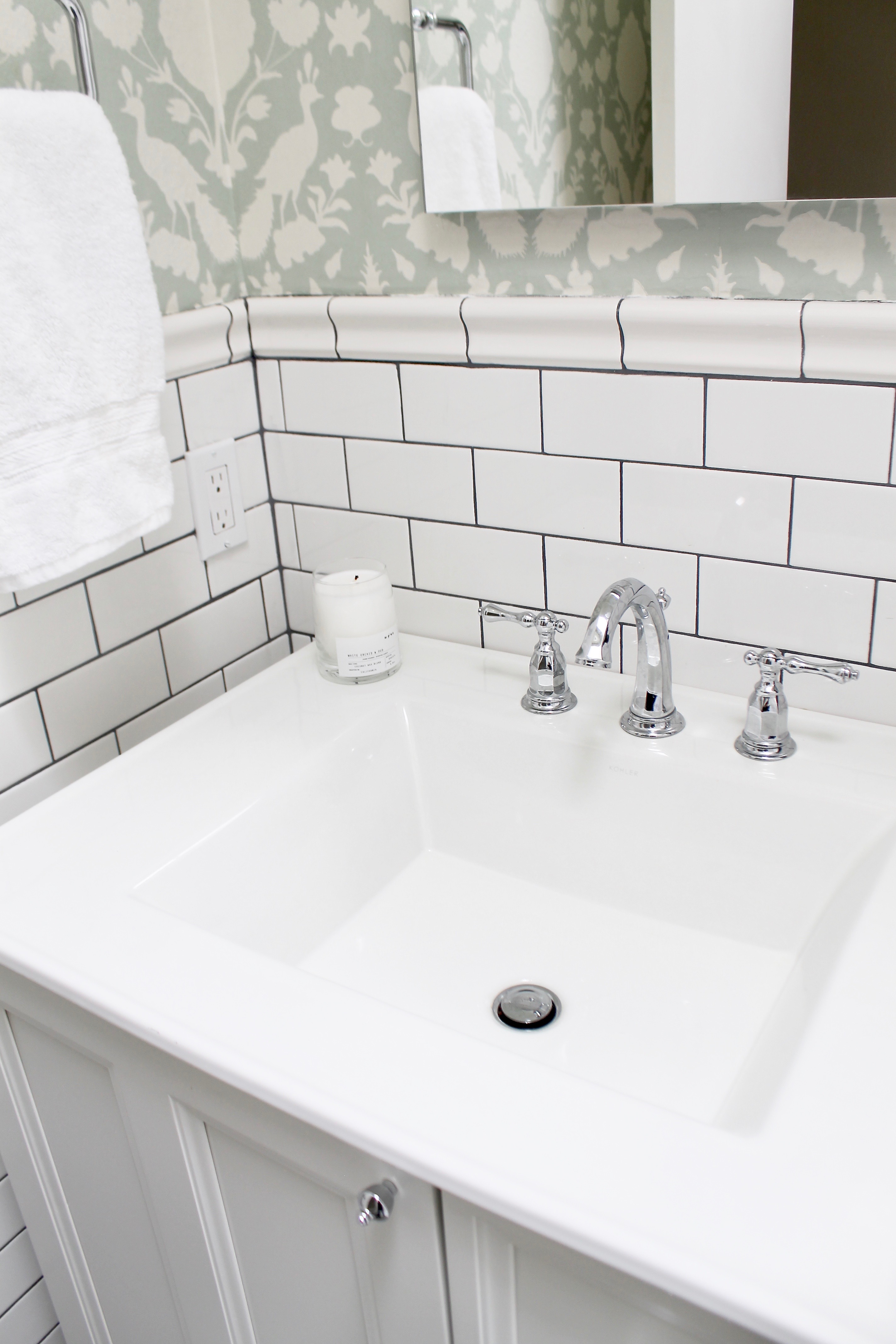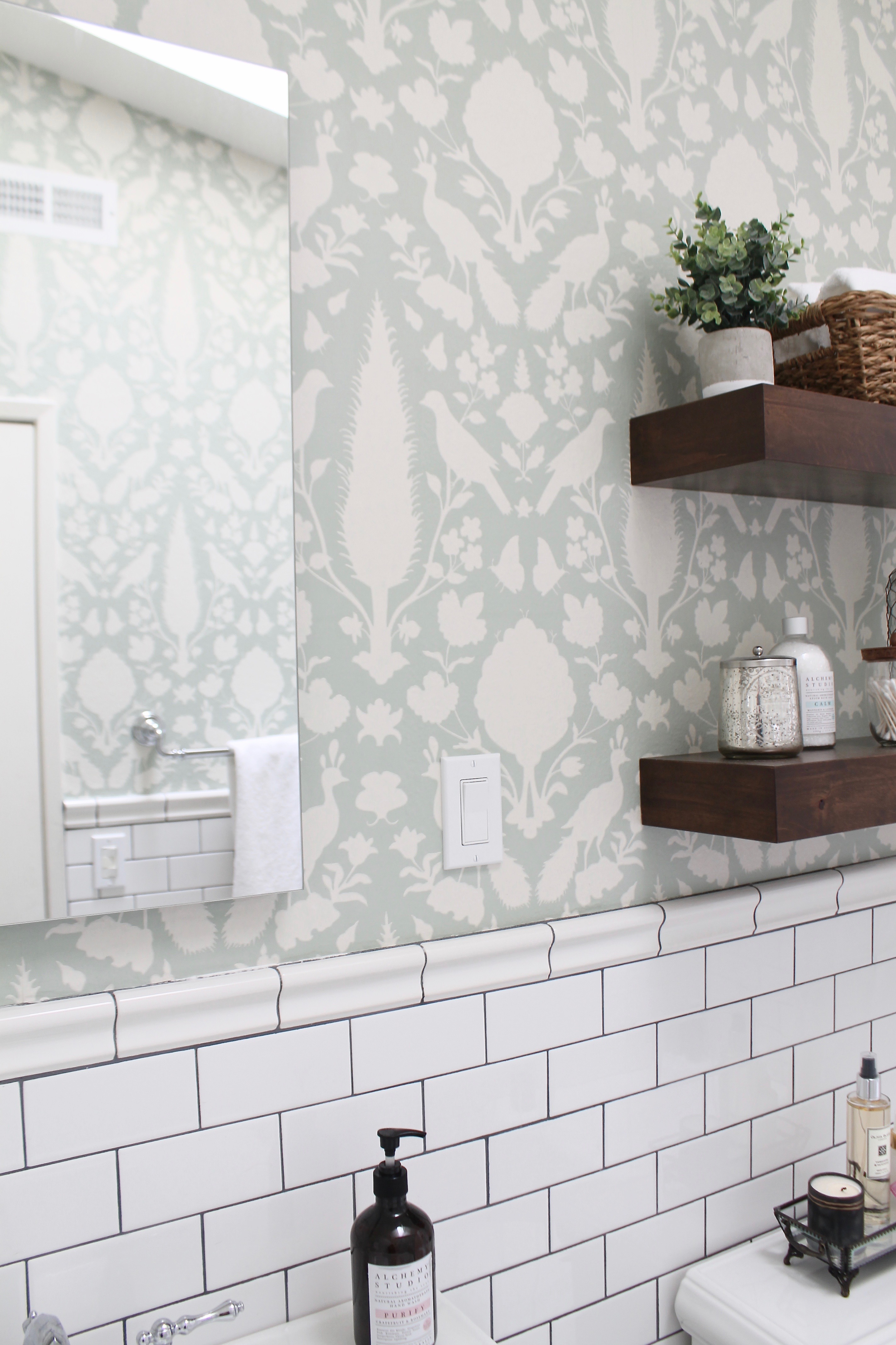 ^^Our Verdera Medicine Cabinet is one of my favorite features of the room. We had the piece installed in the wall so it doesn’t even stick out too far, yet we still have a ton of storage inside. It is clean and simple and I love how the wallpaper reflects in it.^^ ^^Right now I have it full of beauty products and baby things. I love having options for guests when they come to visit.^^ ^^The sink is called Ceramic Impressions and it has been so easy to clean. I also have been loving the vanity. It is real wood and has soft close doors which really fit a lot inside.^^^^Floating shelves were on our must-have list. I knew that there would be a lot of white so I wanted a wooden element to break it up and bring a little warmth to the space. We had a friend of ours make these for us. I just showed him similar styles that I had seen on Pinterest.^^ ^^The shower is such a transformation. Before it looked much smaller. Extending the subway tile all the way to the ceiling really helps to make the bathroom look larger. I also had a little nook installed for extra storage of shampoo and conditioners.^^
