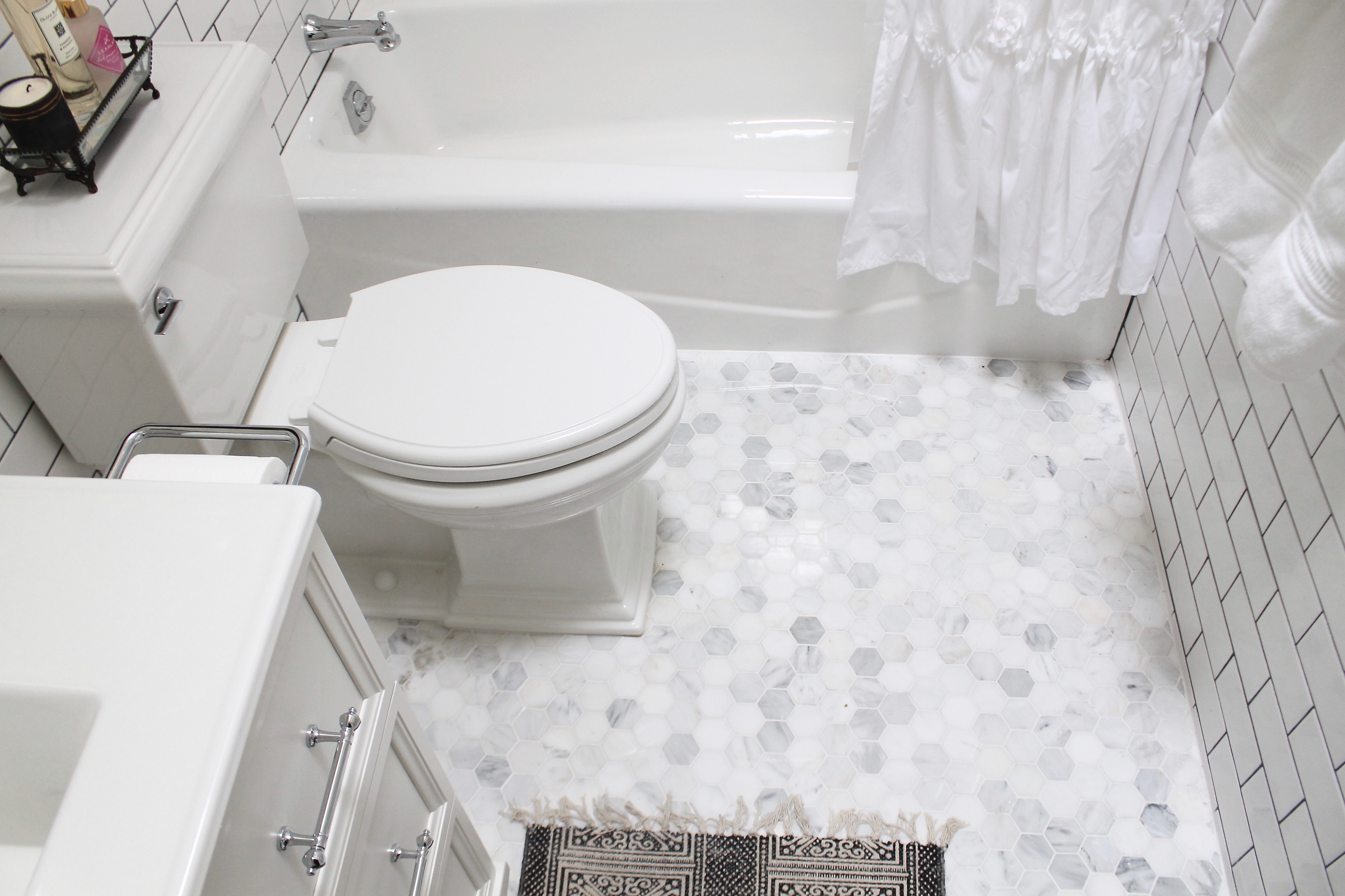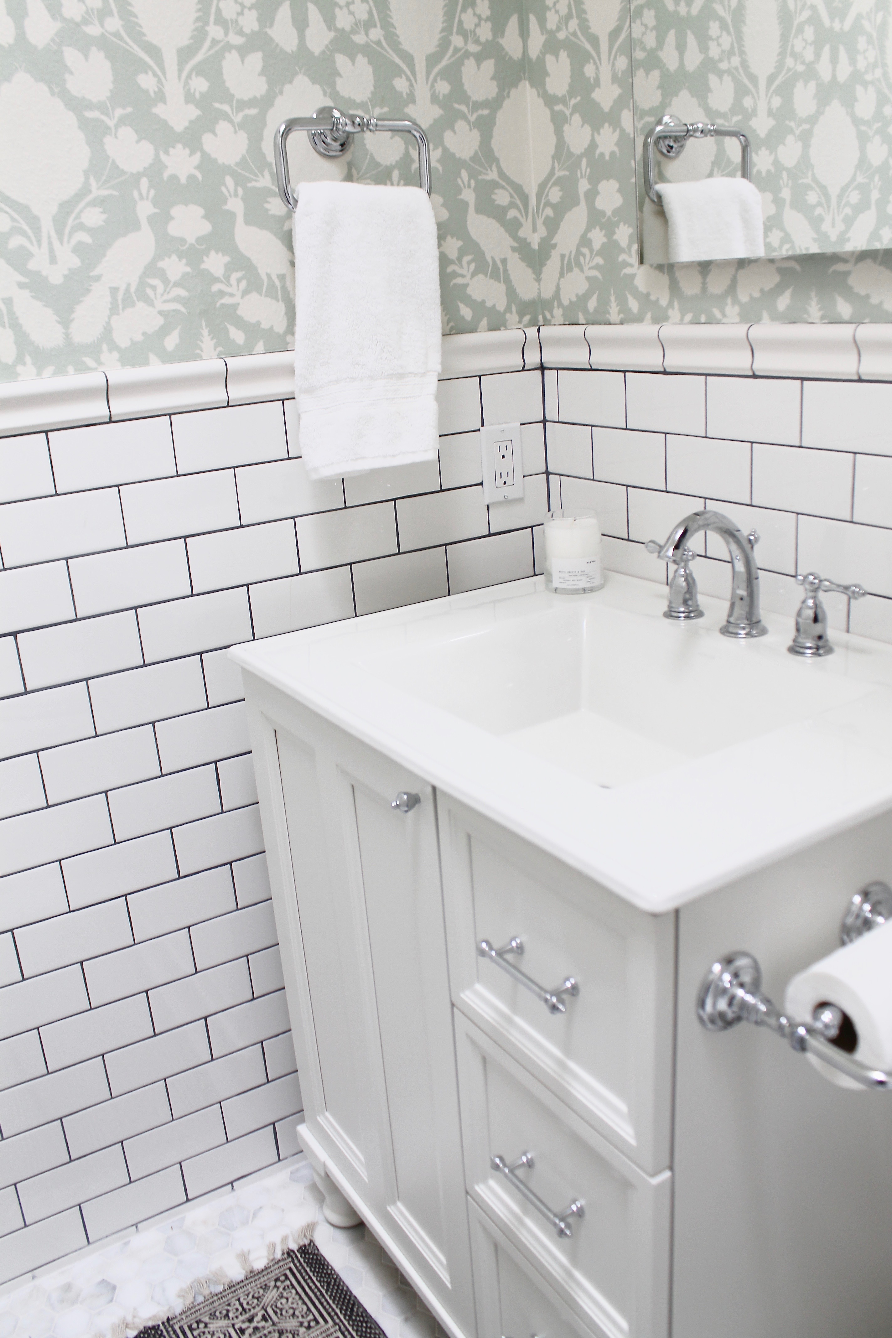 Hey guys! I am so excited to share our completed guest bathroom with you. It was a long process because we completely re-did the entire thing since it was in bad shape to begin with. Even though it took a while I would definitely do it again! I am so happy with how everything turned out. It’s exactly as I envisioned it. I have both before and after pictures for you so you can see the difference. In the very start we changed part of the actual structure of the bathroom to create more space. Originally there was a shelf on the opposite side of the wall (where our dining room is) so we closed that off, which allowed us to open up the ceiling higher in the bathroom. I have to give credit to Andrew for that idea! We used all Kohler products to give the design a very cohesive feel. Honestly, everything works so well, I’m super impressed with the quality, functionality, and aesthetic. I think I love the shower head the most. Well, maybe the sink!! I hope you all enjoy it as much as I do! Something I really wanted when designing this space was a hotel feel but with a few rustic elements. I think the honeycomb marble tiled floor really helped to create that vibe. Also, having the subway tile come up the wall is something I always loved about hotels I’ve stayed at in New York. It gives a clean and classic look.I wanted to keep all the big pieces white so that the printed wallpaper would pop. I also chose a very dark grey grout to add some contrast to the all white tile. For the hardware I went with chrome to bring a touch of elegance to the space. I also love that it complements our kitchen! When decorating our home, I like all the rooms to have their own look but keep with a similar style throughout. That way the whole home has a very cohesive feel to it and I can switch out decor accents between all the rooms.