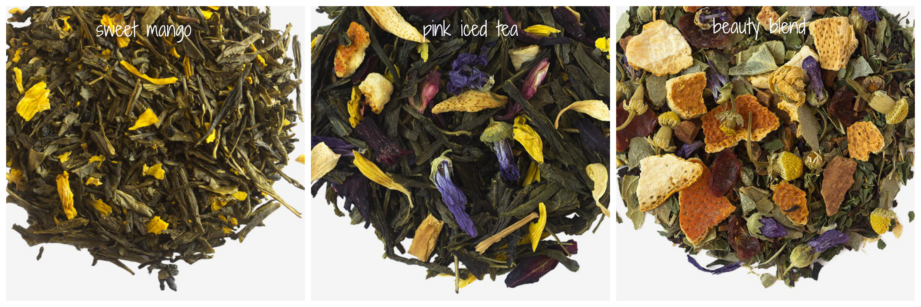 Sweet Mango: sencha green tea, natural mango flavor, sunflower petals (very hydrating and full of antioxidants)