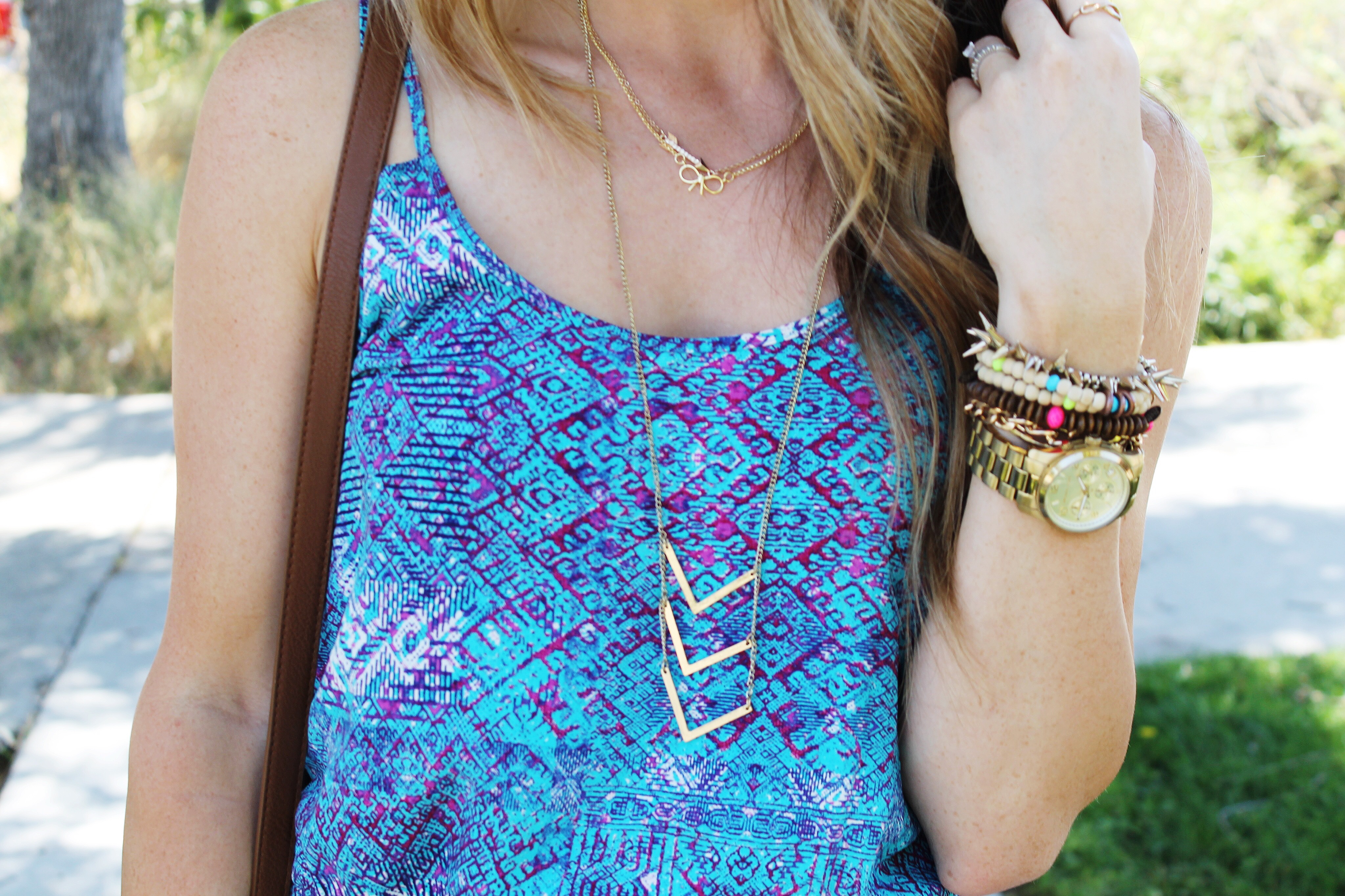 It doesn’t get much more comfortable than a romper! Forever 21 has so many cute rompers and dresses so go go go! I just got a couple dresses there for some upcoming weddings. One thing I love about wearing a one piece in a bright print and color, is that you can keep everything else slightly understated. I keep my shoes and bag brown, and my jewelry gold (per usual). This look is perfect to go out to lunch, shopping, the beach…basically it is very versatile! Rompers for the win!