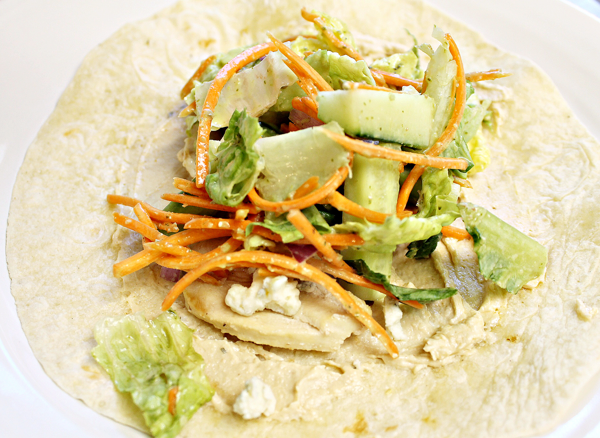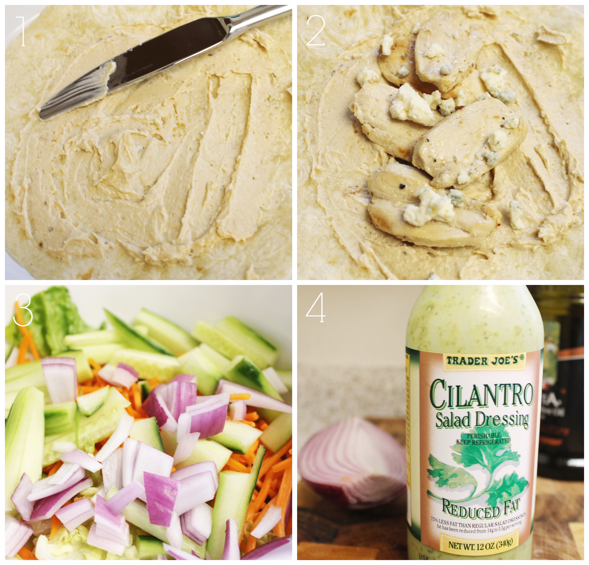 What you will need: tortillas sliced chicken breasts shredded carrots romaine lettuce sliced cucumber red onion gorgonzola cheese (feta would taste great too) hummus cilantro dressing (mine is from Trader Joe’s) t 1. First, spread the hummus onto a tortilla. 2. Add the grilled chicken and cheese. I sliced my chicken into strips then cooked it in a pan with coconut oil until it was started to brown a little. I like putting the cheese on top of the warm chicken so it melts slightly. 3. Cut up all your veggies and throw them in a bowl. 4. Mix in cilantro dressing. You could also use olive oil and apple cider vinegar, or another light dressing you have on hand. g Place some veggies on top and enjoy!