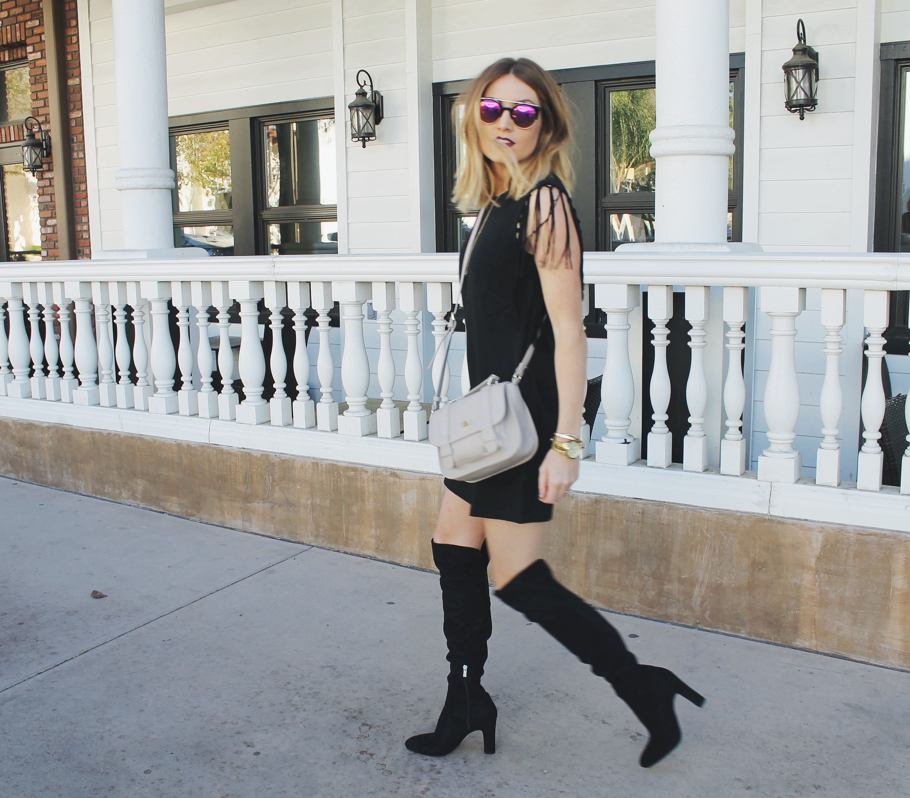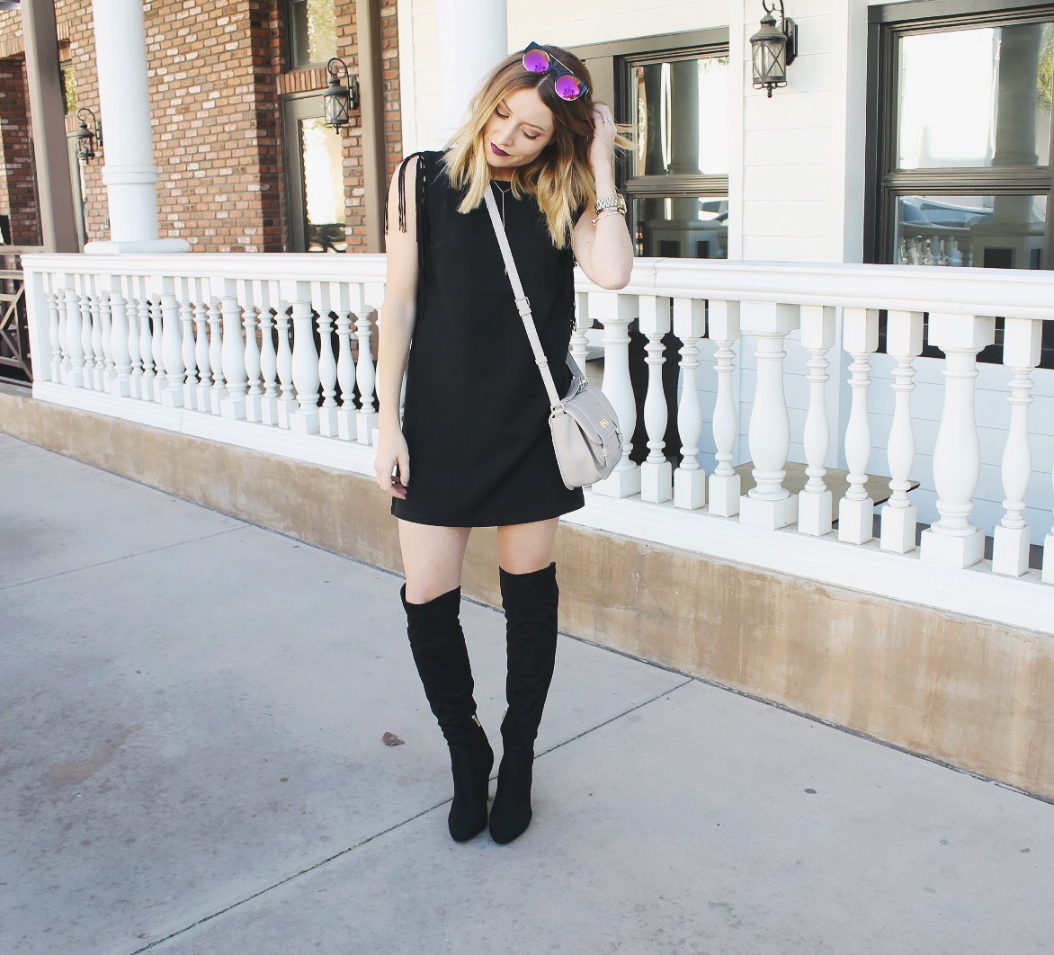 Hey guys! I’ve been so excited to share this outfit with you. Forever 21 just launched a new shop section called Forever 21 Now and in honor of it, I have some super affordable pieces for you to shop! They’ll launch new pieces every week based on current trends. Check out their instagram HERE. I love mixing things up and trying out new styles. I decided to wear a darker lip for this ‘mostly’ black look because it’s fall, so why not! The lip color I’m wearing is the color I created in a recent video. You can watch that HERE. I’m loving this dress with the fringe sleeves. I think it adds a little edge to a simple dress. To make it more fall appropriate I added over the knee boots which I am so obsessed with. These are incredibly comfortable and dress up any outfit. I think these would look great with some skinny jeans! Let me know what styles you have been loving this season in the comments! Thanks so much for stopping by!